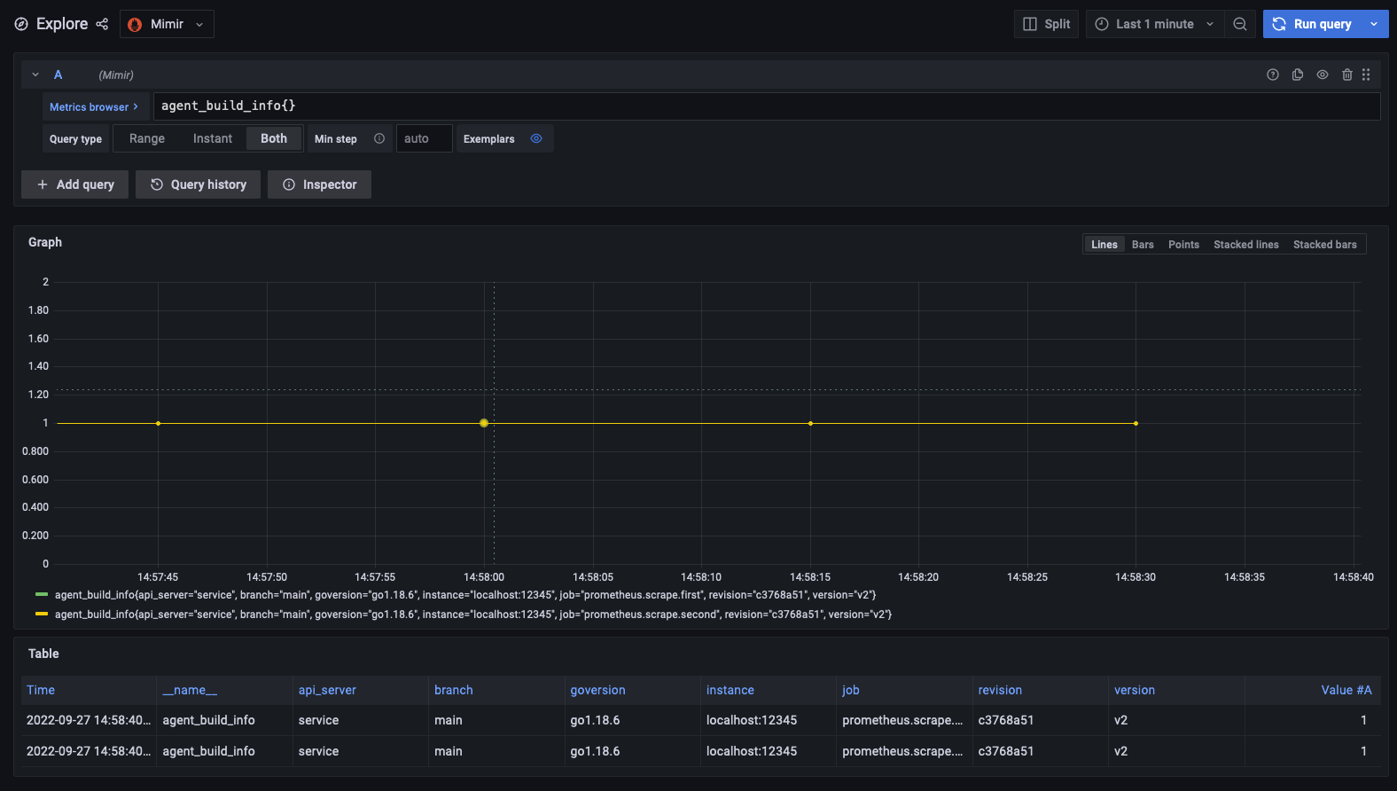 There are two scrapes each sending metrics to one filter. Note the job label lists the full name of the scrape component.