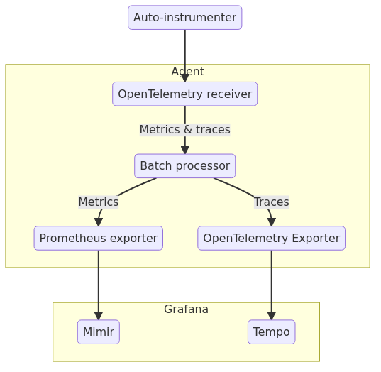 - Agent mode (recommended mode): the auto-instrumentation tool will send the metrics and the traces to the Grafana Agent, which will process and send them to Mimir and Tempo. In this scenario, the Agent takes care of the authentication required by the Grafana Mimir/Tempo endpoints. This mode also integrates better with some Grafana exclusive features, such as the span-to-metrics and span-to-service graph converters.