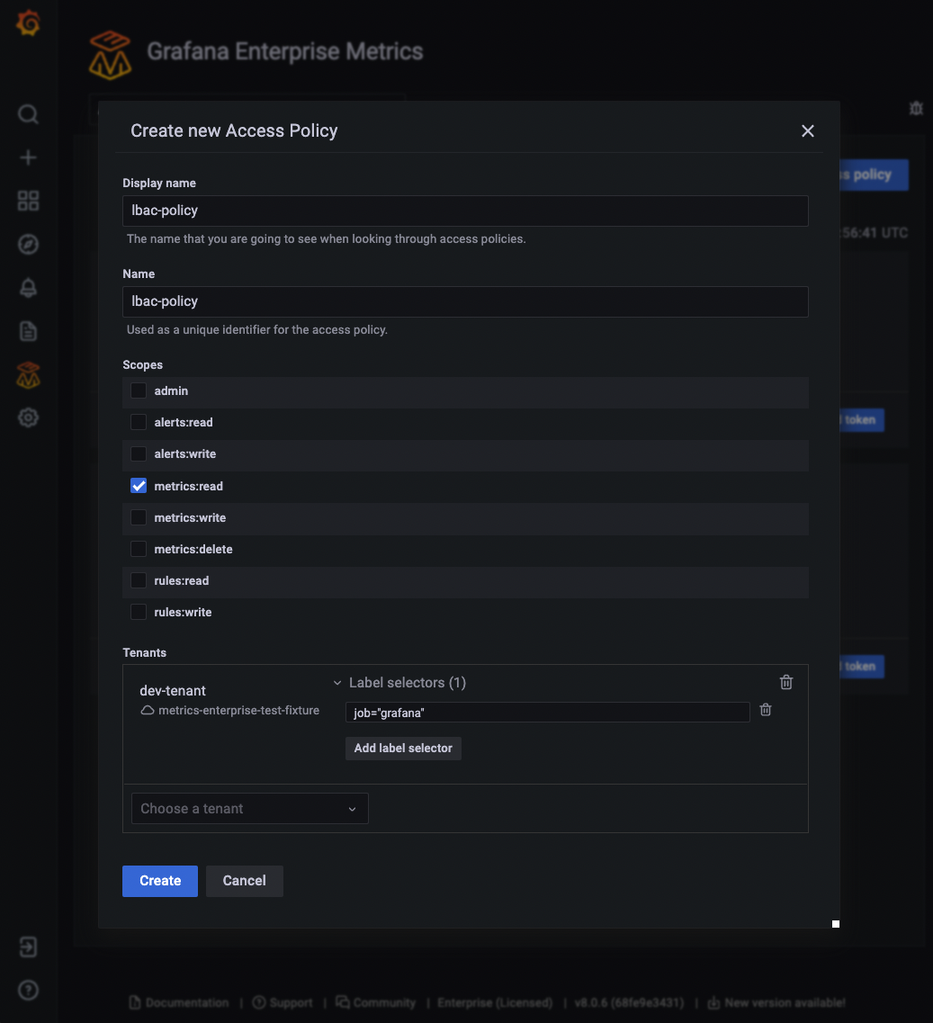 One common use case for creating an LBAC policy is to exclude metrics with a specific label. For instance, a label policy that excludes all series with the label secret=true would be created by just adding a select with secret!="true" when creating an access policy. This can be seen in the image below: