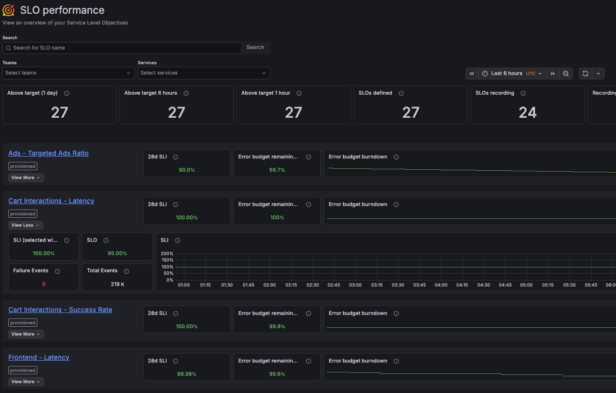- View all SLOs and their current performance in one place, and filter them by team or service.