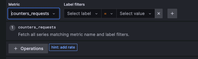 The user interface (UI) also lets you select metrics, labels, filters, and operations.