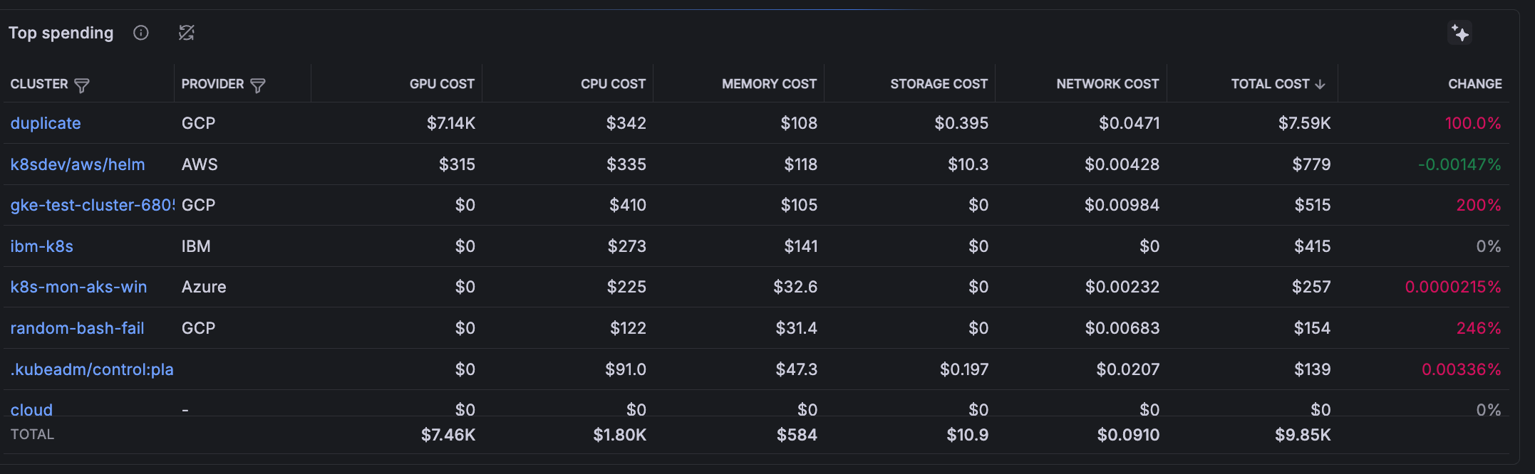 - Identify Clusters with the highest change. The change column shows the percentage difference between the current time range value and the previous equivalent period.