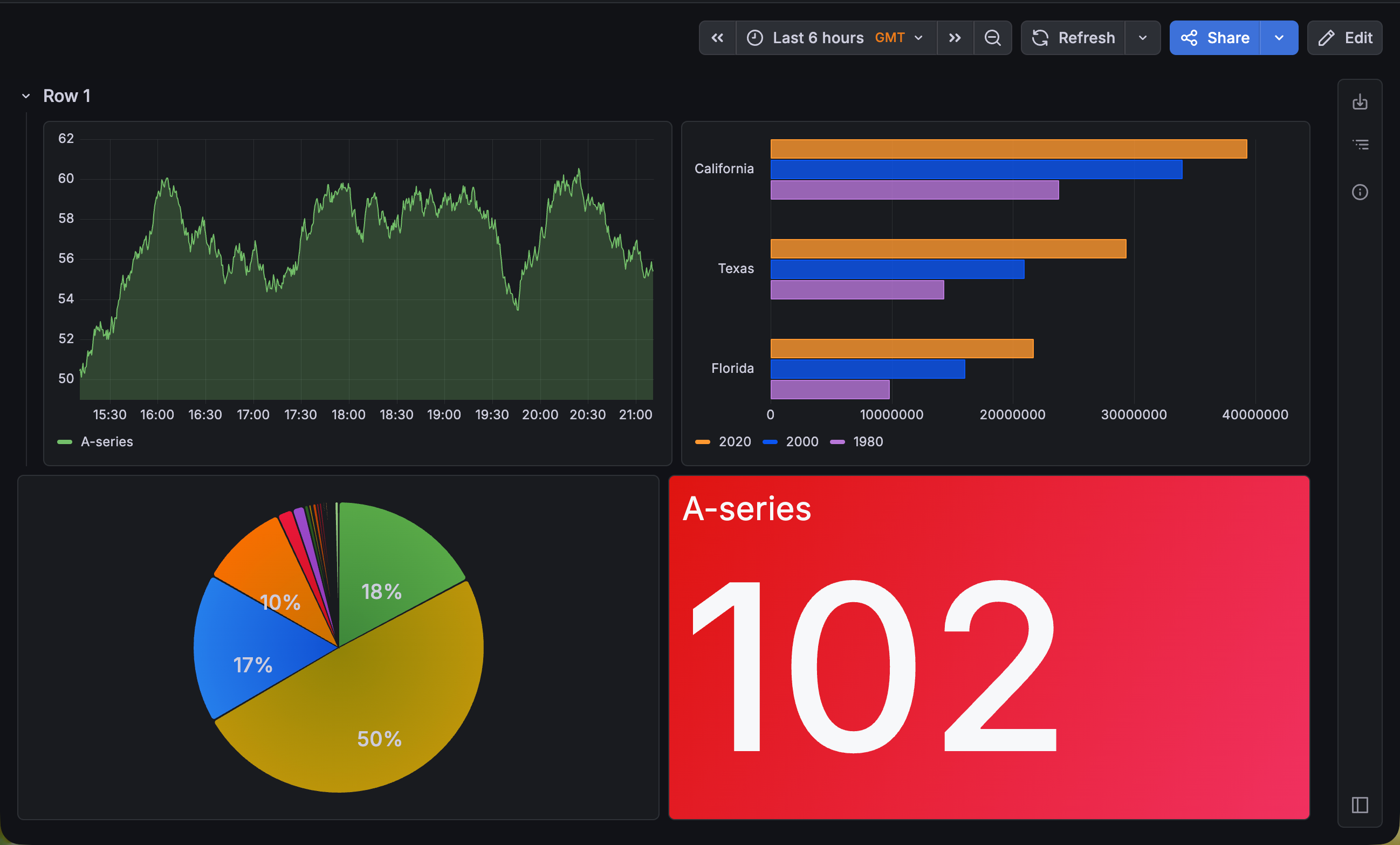 - Also, you can have different panel layouts in within a row or tab. In this dashboard, one tab contains two rows that have two different layouts.