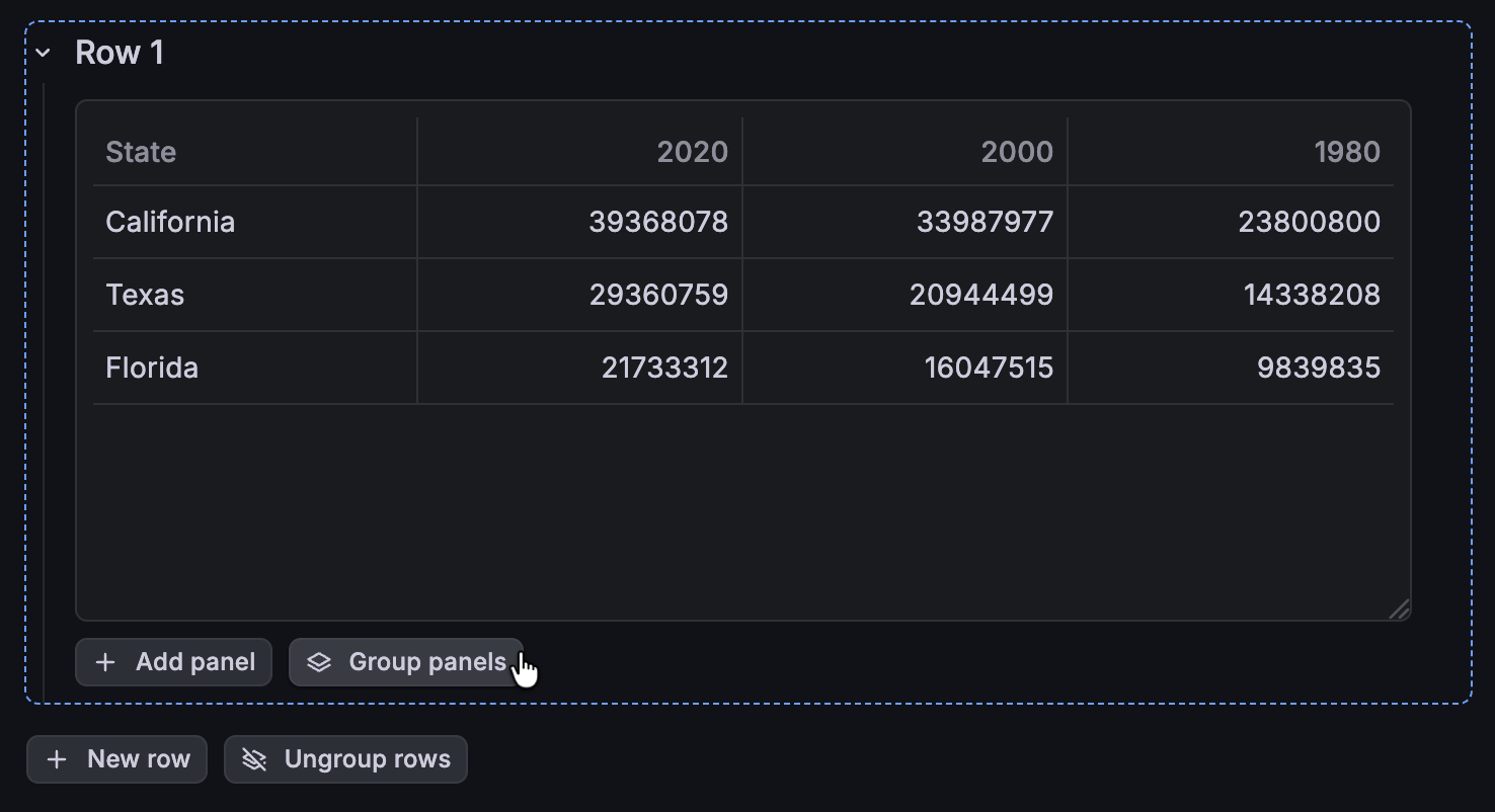 In view mode, the row header is hidden, so that the panels in that row appear ungrouped. In the following image, the panels are grouped into two rows, but the header of the second row is hidden: