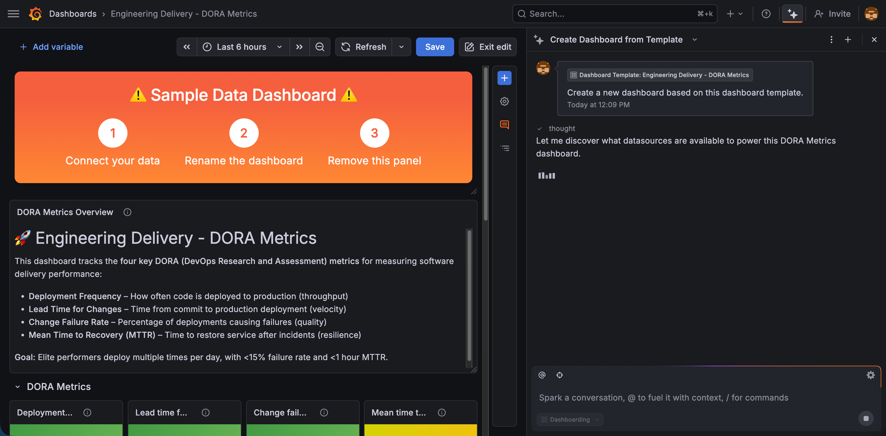 The templates provide standardized dashboard layouts designed to help you answer engineering or business questions consistently. For instance, the DORA template allows all teams within an organization to measure delivery performance using a widely adopted industry framework.