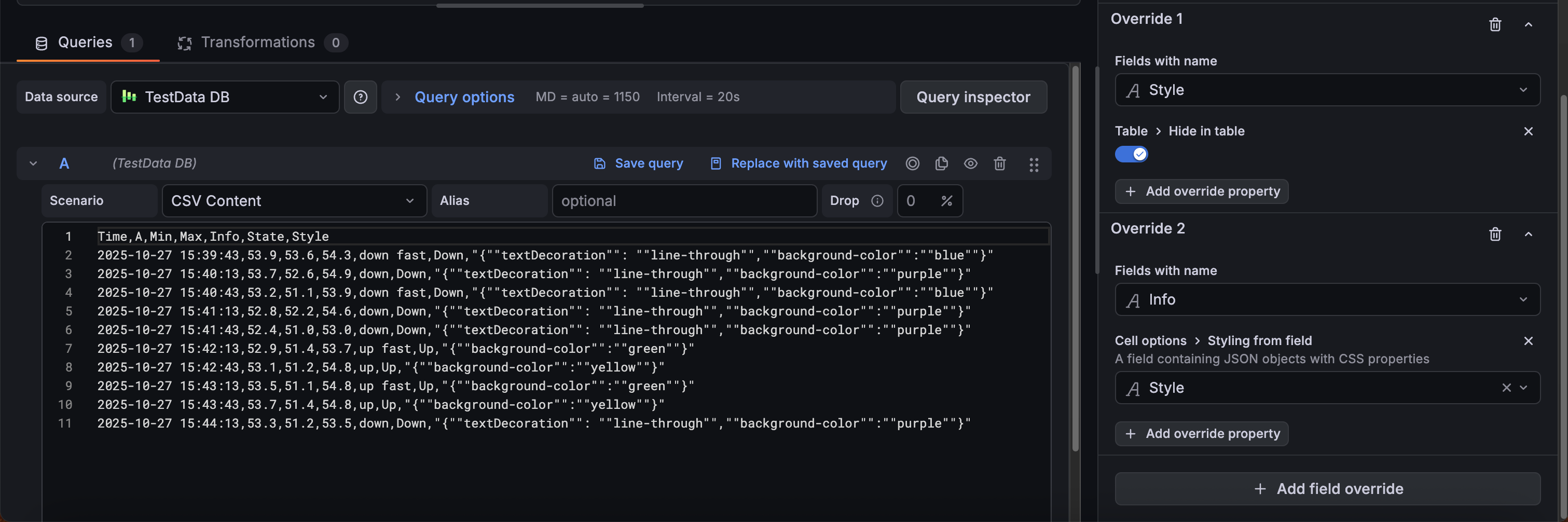 - The “Info” field is using the Cell options > Styling from field override property with the “Style” field as the source.