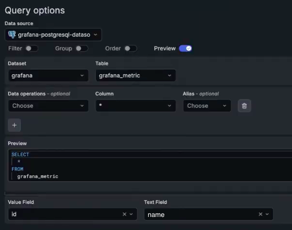 textandvaluefor the label and value shown in the drop-down, and add additional properties as needed. For the JSON format and examples, refer to Multi-property custom variables in Add and manage variables.Type: Query – Write a SQL query that returns multiple columns. In the variable editor, set Value field and Text field to the columns that supply the value and the label for the drop-down. Add one column per property you want to reference; each column name becomes a property name. In panels and queries, reference a property with