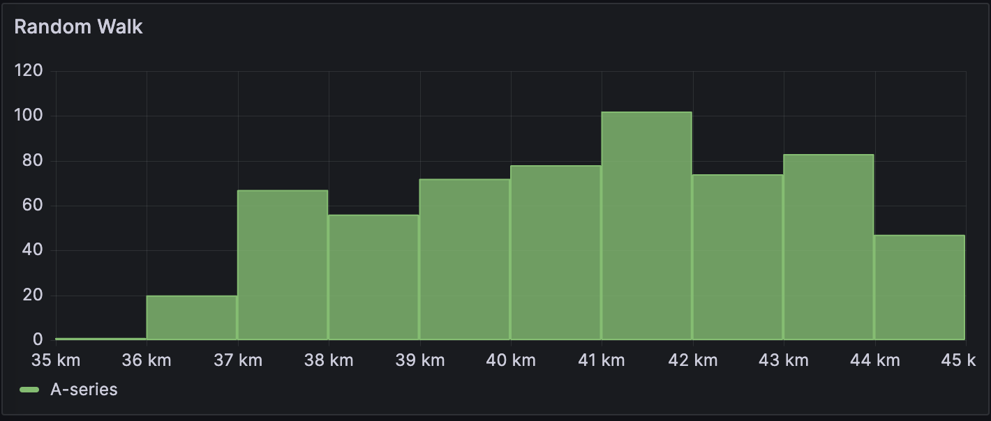 Histograms calculate the distribution of values and present them as a bar chart. Each bar represents a bucket; the y-axis and the height of each bar represent the count of values that fall into each bucket, and the x-axis represents the value range.