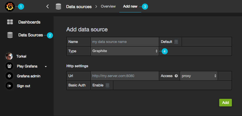 Dashboardslink you should find a link namedData Sources.NOTE: If this link is missing in the side menu it means that your current user does not have the