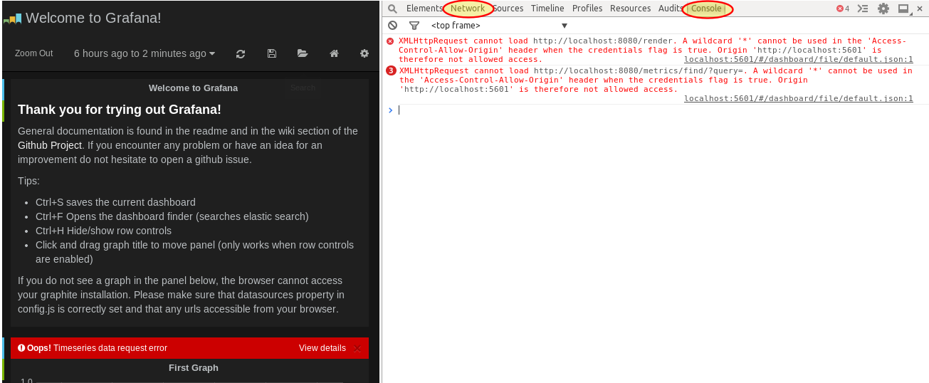 When setting up Grafana for the first time you might experience issues with Grafana being unable to query Graphite, OpenTSDB or InfluxDB. You might not be able to get metric name completion or the graph might show an error like this: