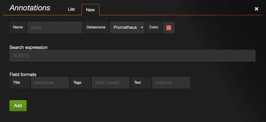 dropdown. This will open the Annotations edit view. Click the Add tab to add a new annotation query.