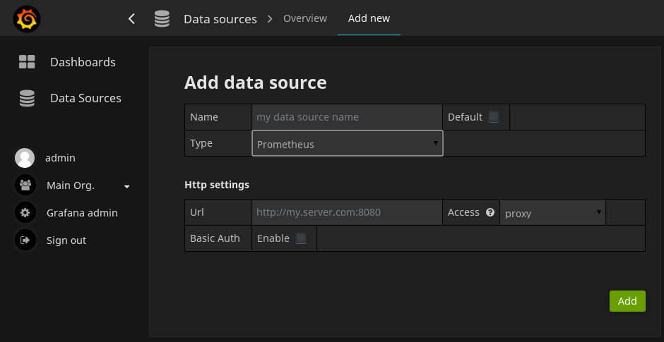 Grafana includes support for Prometheus Datasources. While the process of adding the datasource is similar to adding a Graphite or OpenTSDB datasource type, Prometheus does have a few different options for building queries.