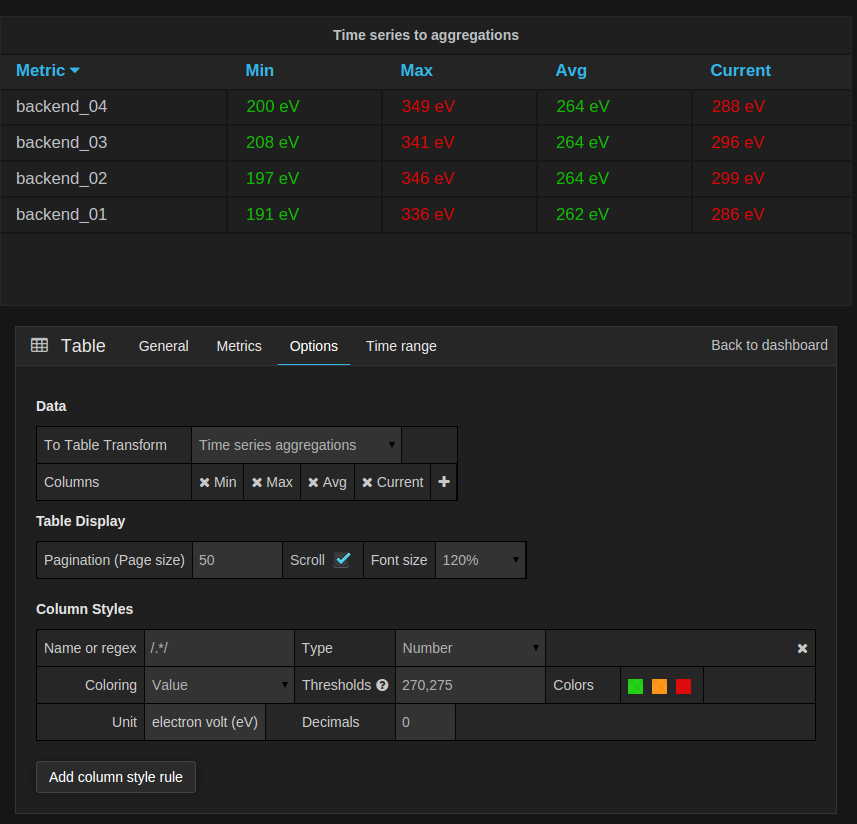 Name or regex: The Name or Regex field controls what columns the rule should be applied to. The regex or name filter will be matched against the column name not against column values.Type: The three supported types of types areNumber,StringandDate.Title: Title for the column, when using a Regex the title can include replacement strings like$1.Format: Specify date format. Only available whenTypeis set toDate.ColoringandThresholds: Specify color mode and thresholds limits.UnitandDecimals: Specify unit and decimal precision for numbers.Add column style rule: Add new column rule.