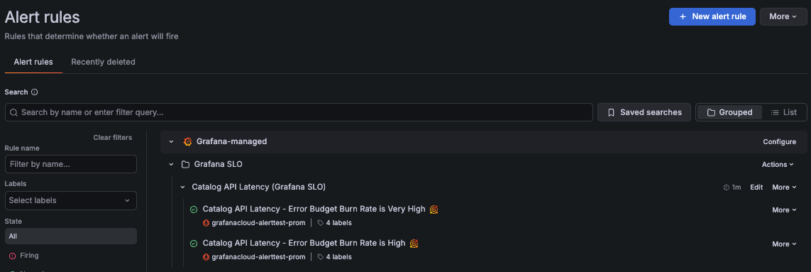 When an SLO has alert rules enabled, Grafana Alerting generates the corresponding burn-rate alert rules under the Grafana SLO folder.