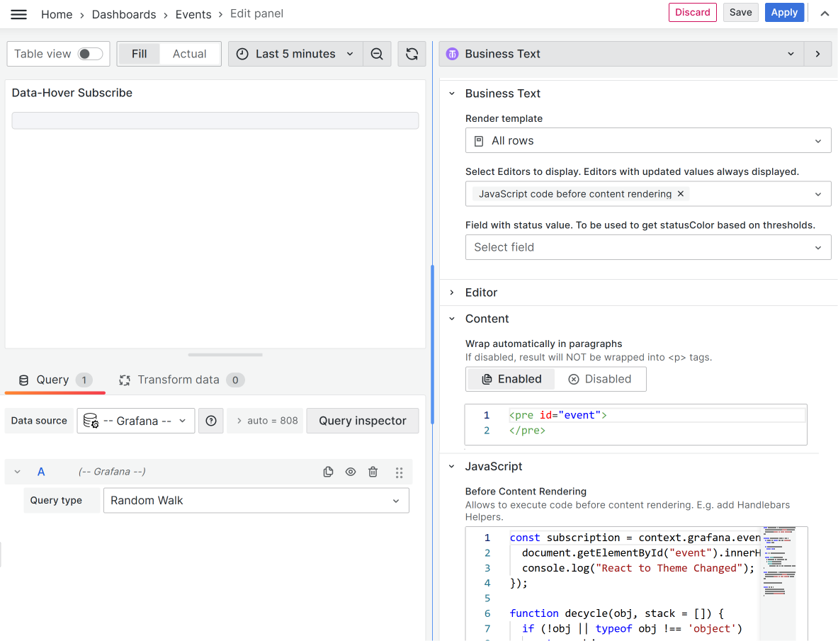 Grafana uses an event bus to publish application events that notify different parts of Grafana when users interact with it. The Business Text panel can respond to these interactions by subscribing to one or more events.