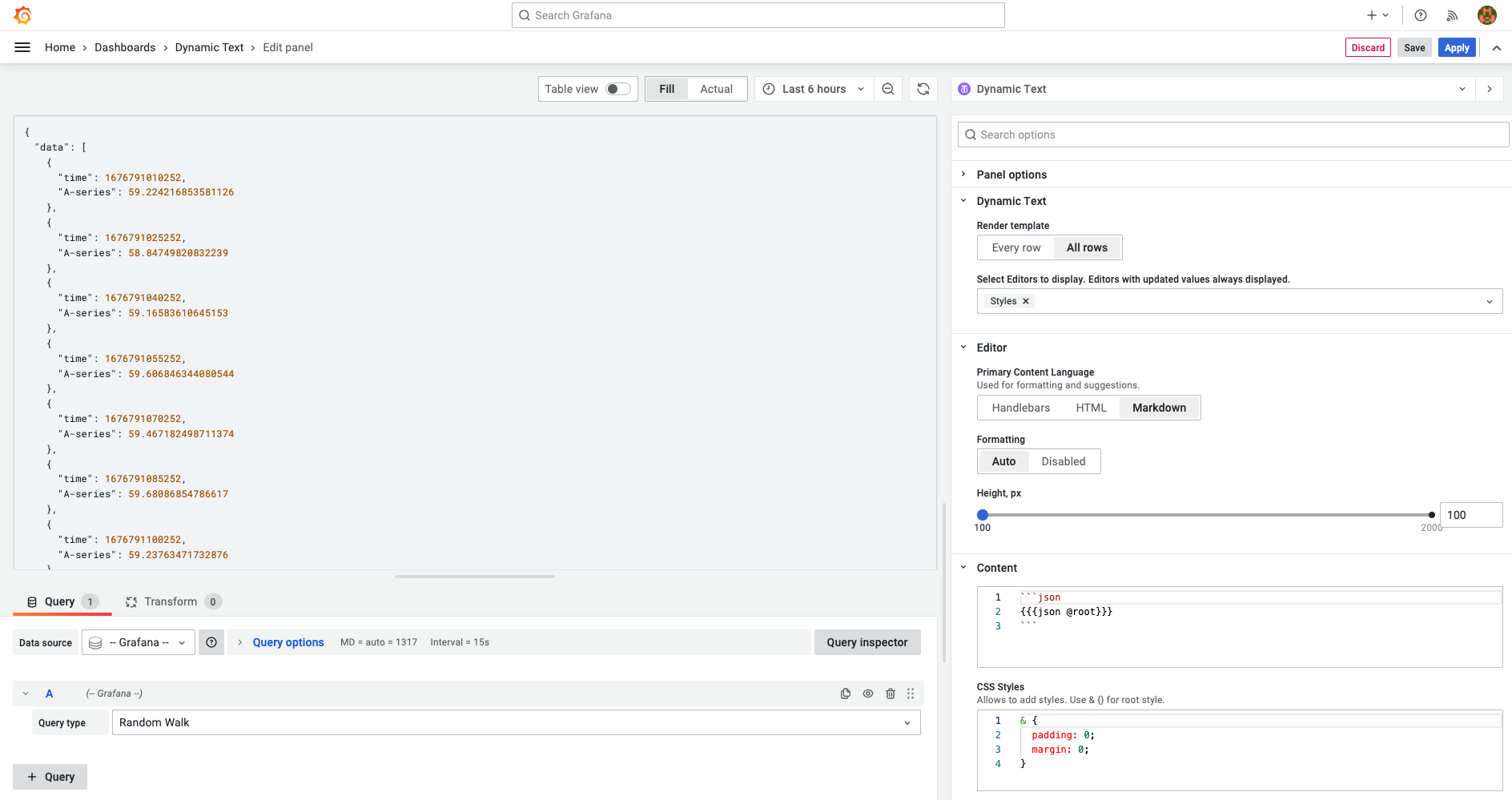 The JSON helper expects an object or an array to display as a formatted string. If the data source returns a string, transform it to a JSON object using the Convert field type transformation.