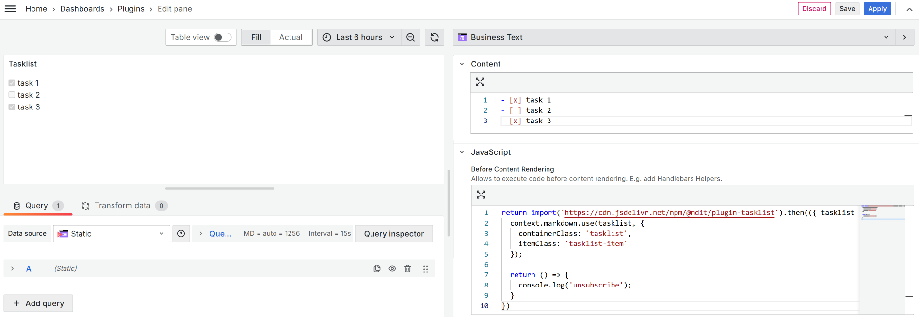 The Business Text panel supports JavaScript library imports in Before content rendering starting from version 5.3.0.