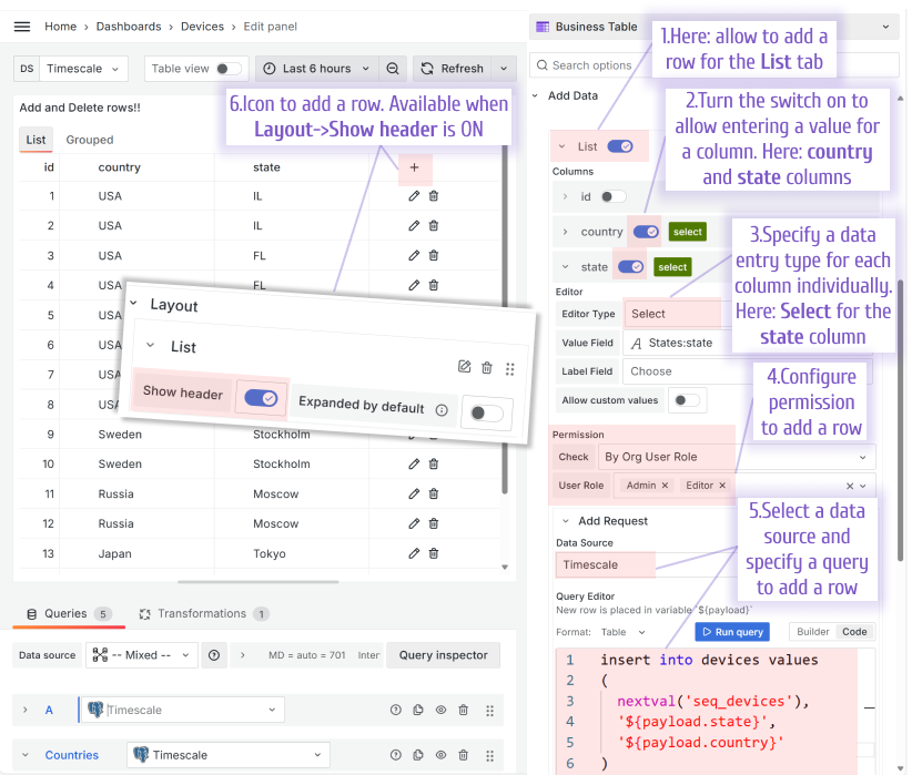 - Layout > Show header set to ON so that you have access to the add row (plus icon) button.
