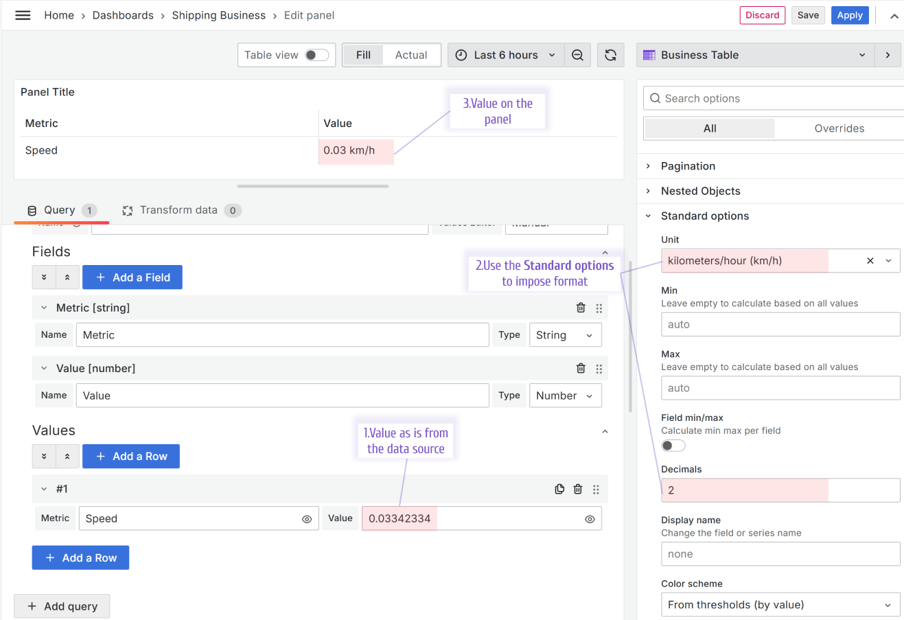 The values displayed in the Business Table visualization can be formatted using the Grafana Standard options.