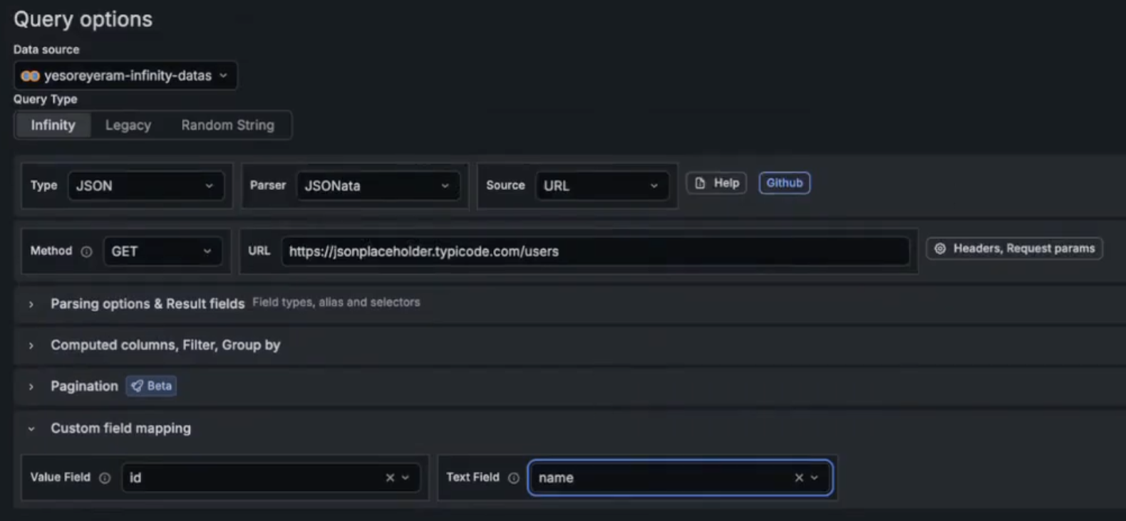 To create a multi-property variable with the Infinity data source, use Type: Query. Configure an Infinity query that returns multiple columns. In the variable editor, expand Custom field mapping and set Value field and Text field to the columns that supply the value and the label for the drop-down. Each additional column in the result becomes a property you can reference. In panels and queries, reference a property with ${varName.columnName}.