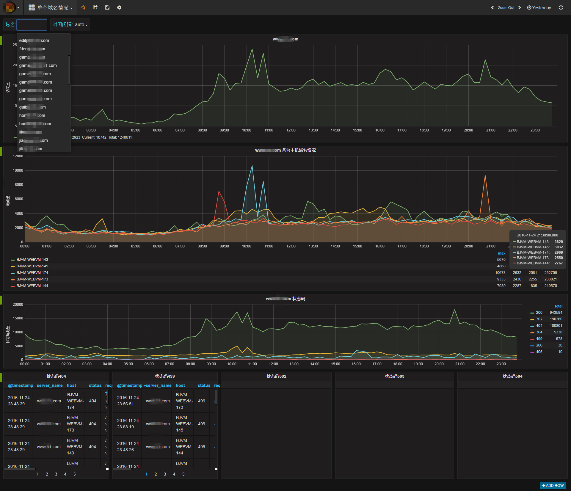 The proxy-单个域名 dashboard uses the elasticsearch data source to create a Grafana dashboard with the graph and table panels.