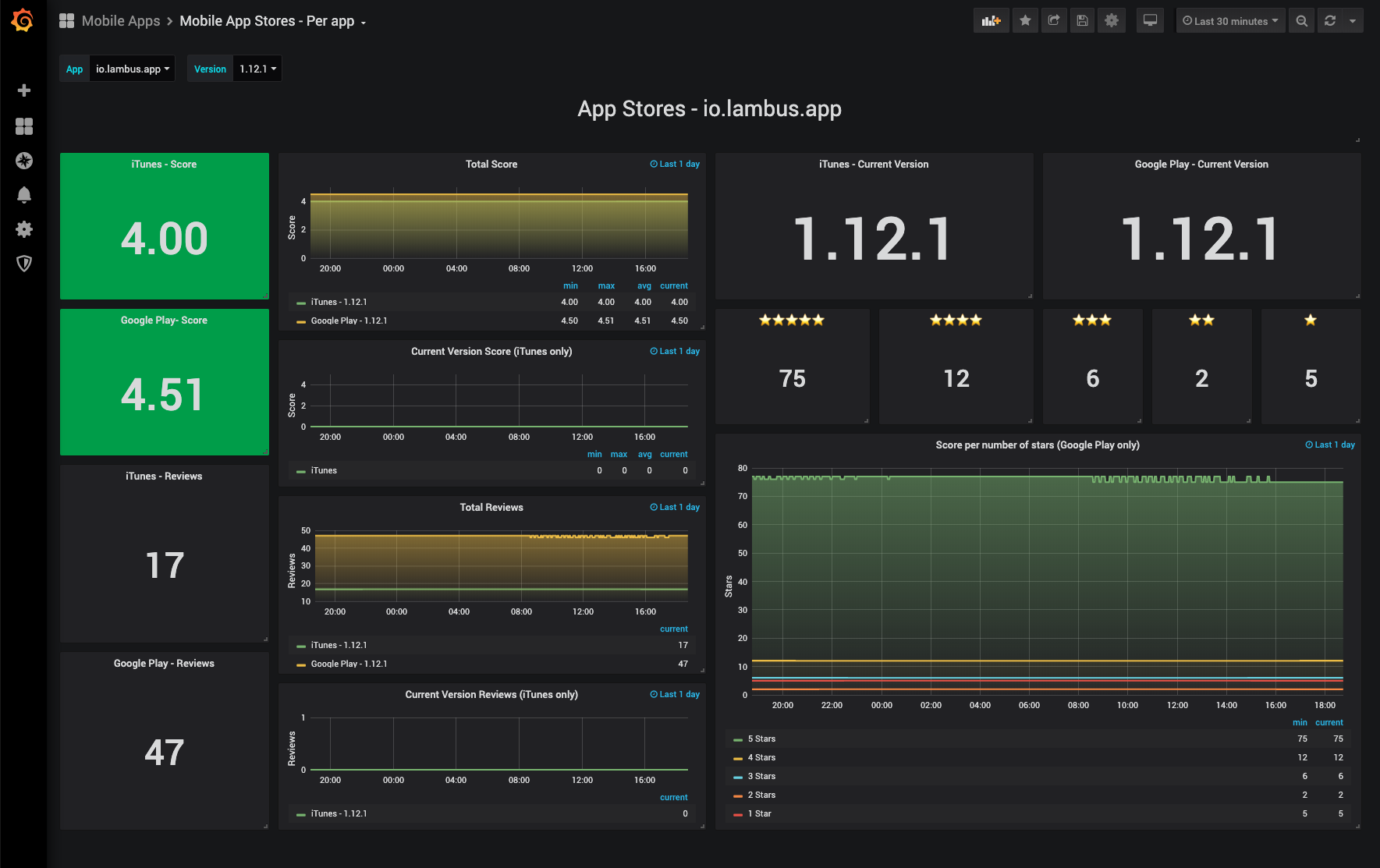 This dashboard is using the data collected by Prometheus with the App Stores Prometheus Exporter.
