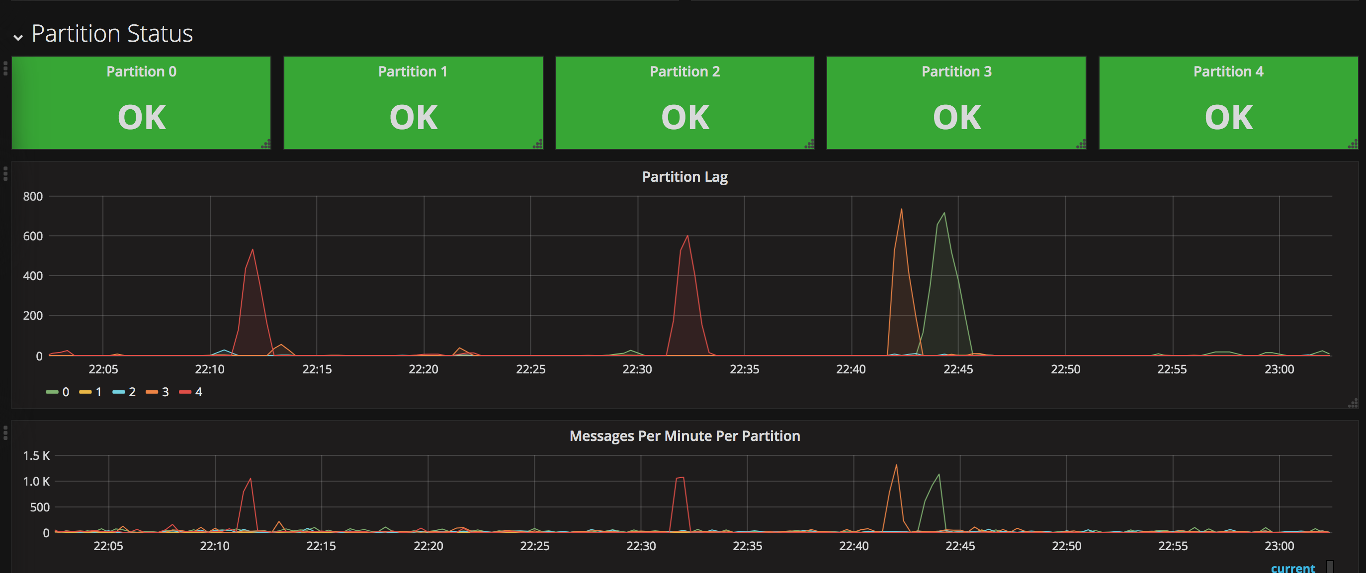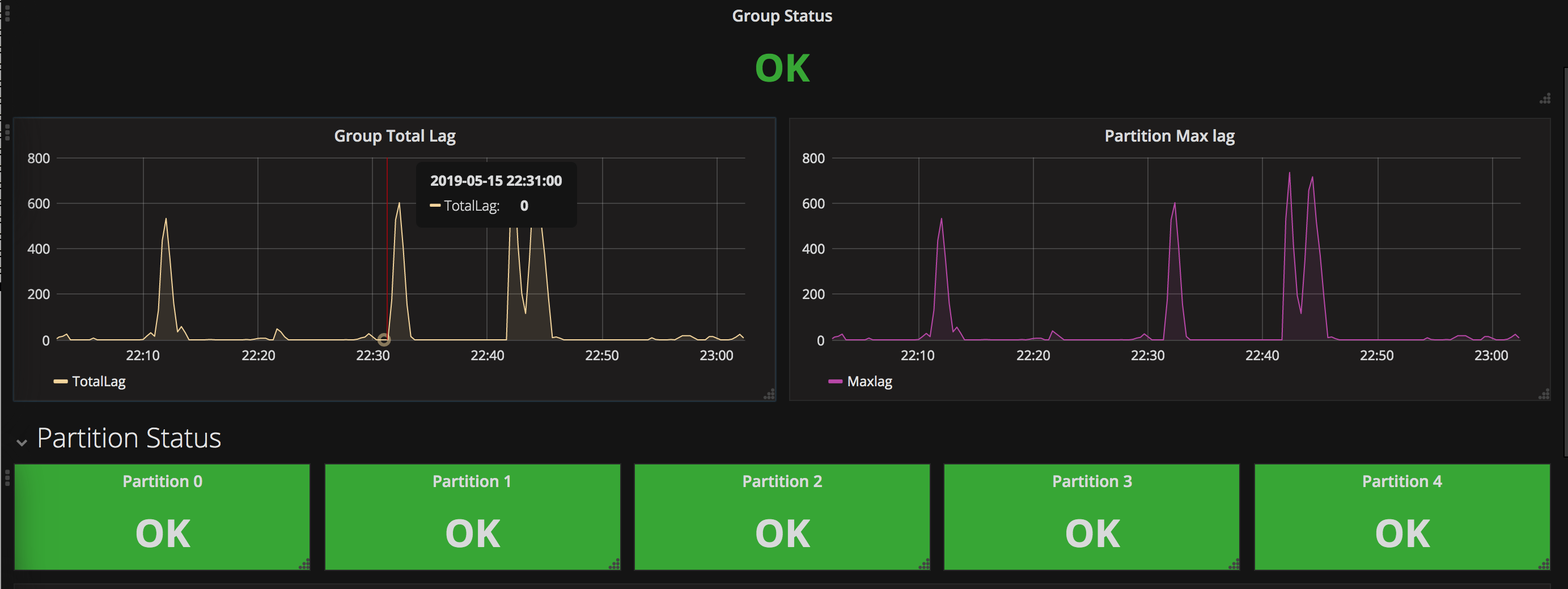 This dashboard is templated by consumer group and topic. It will show you a high level of data for the group as a whole, such as the status, the total lag, and the max lagging partition. Then as you scroll down it breaks the status and lag out by every partition for the topic