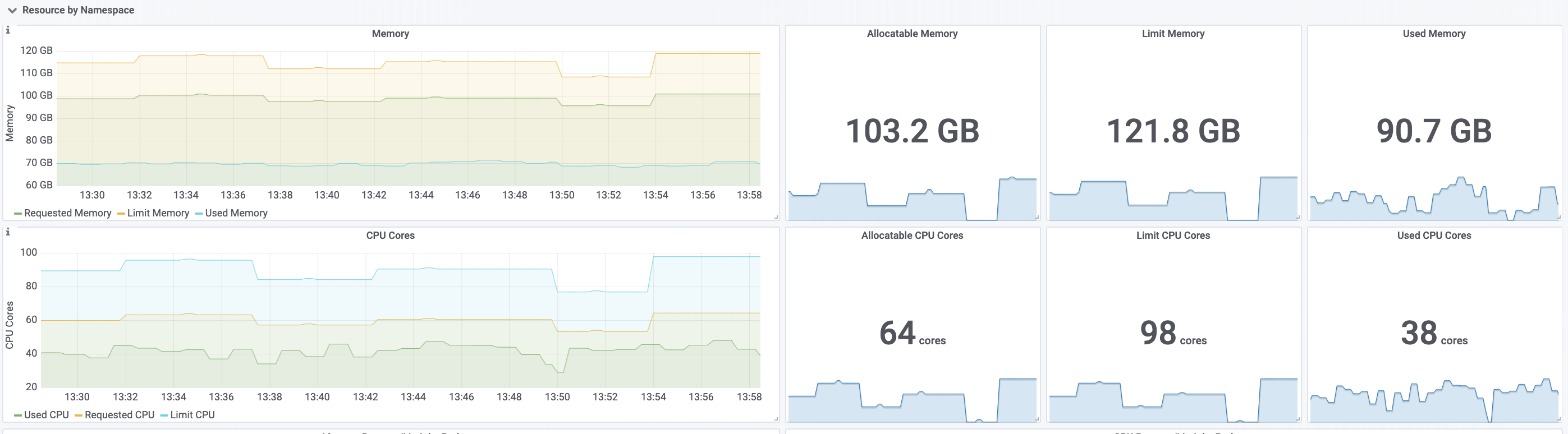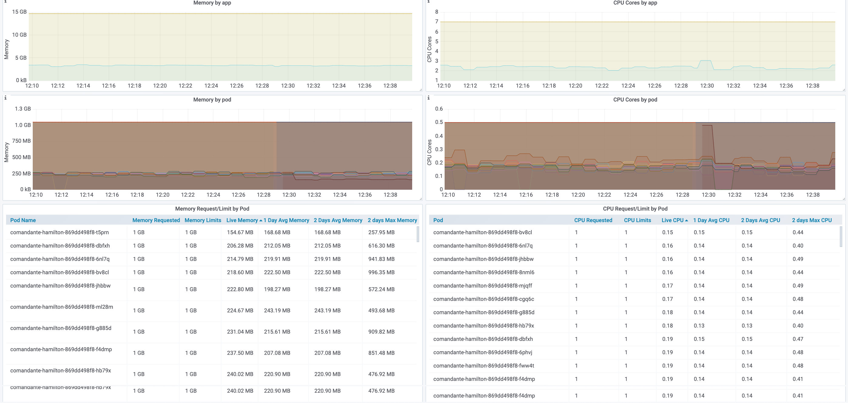 - Memory/CPU Request vs Memory/CPU Limit vs Memory/CPU live of all namespace pods.