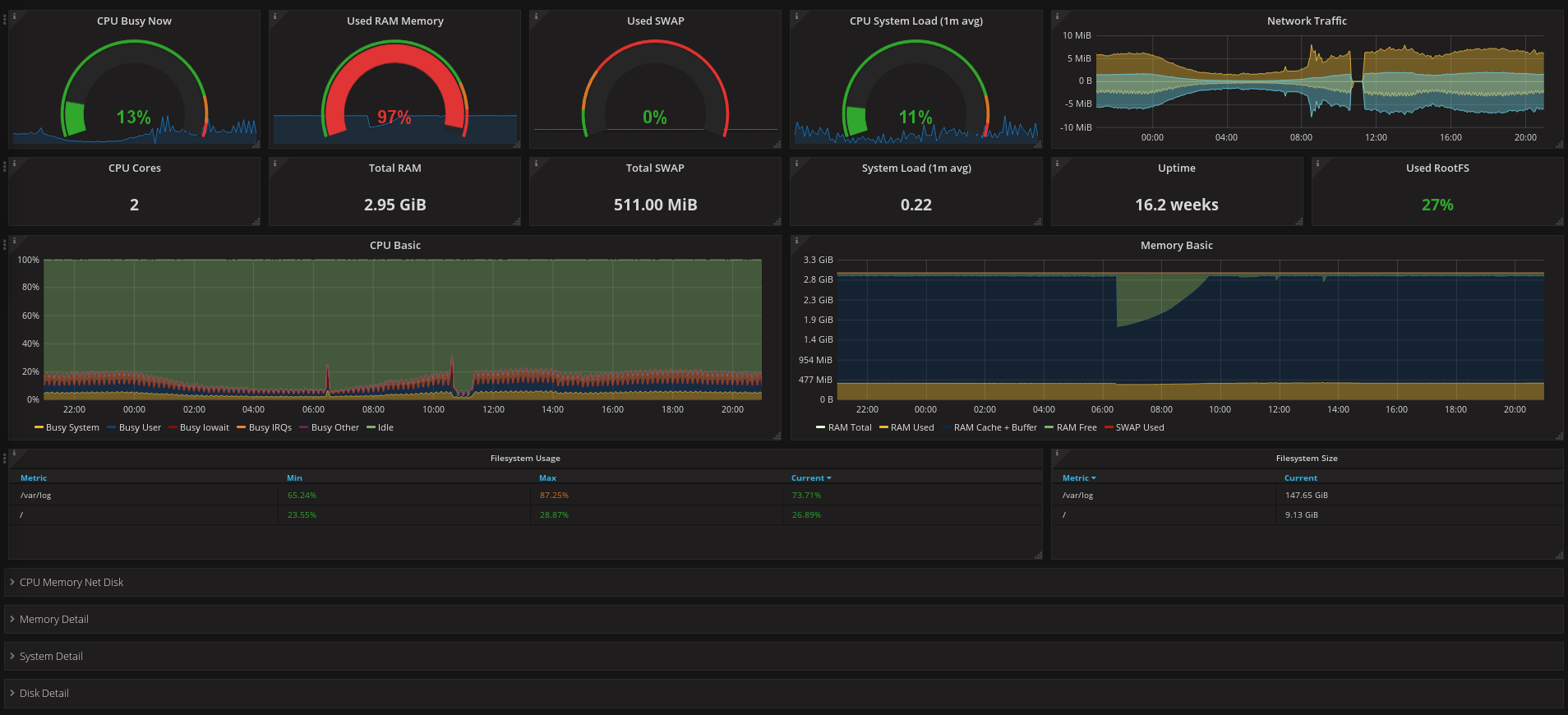 Fork dashboard https://grafana.com/dashboards/1860 Change list of host from instance(IP address) to hostname. So more readable.