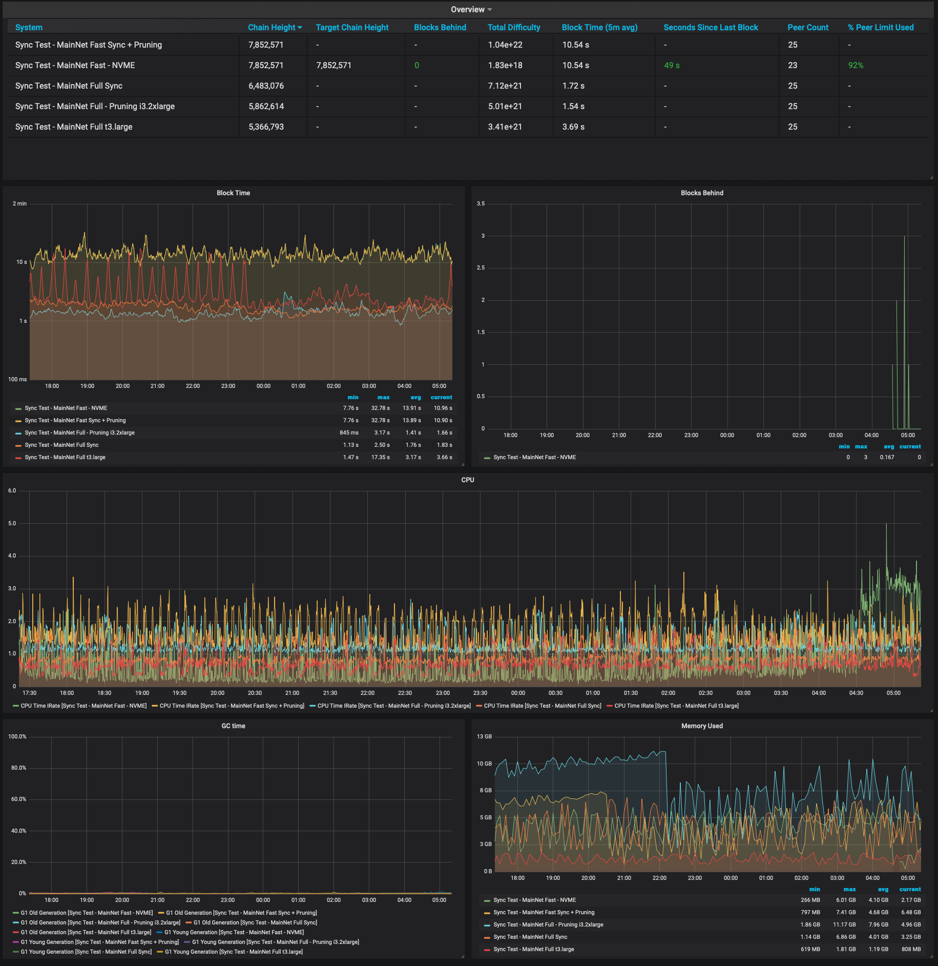The dashboard provides information on how well connected Besu is to the network, sync state, block import rate, along with CPU and memory usage statistics.