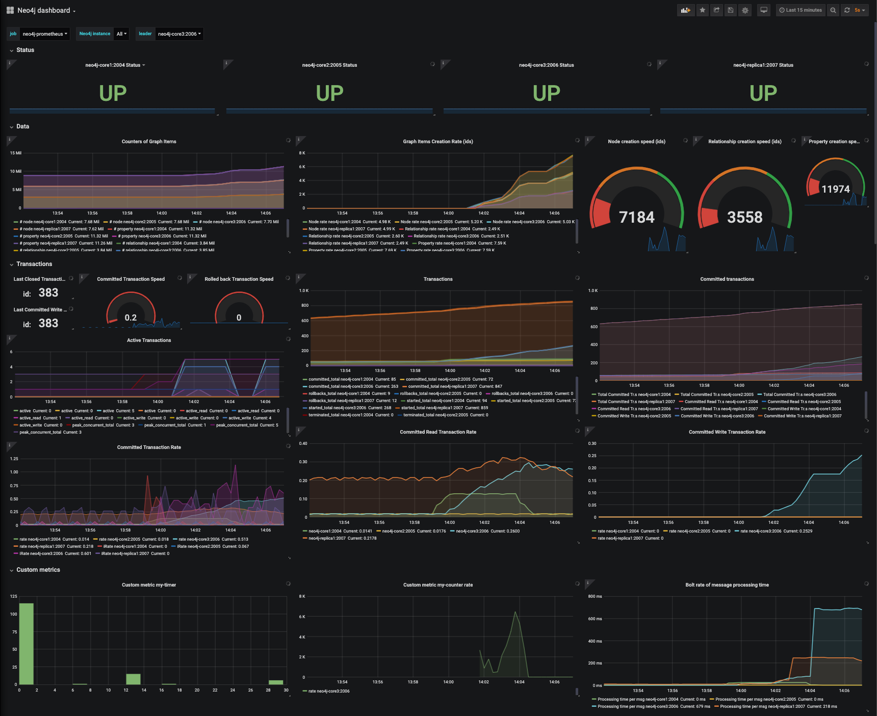 Neo4j cluster monitoring dashboard, with Prometheus data source. Read more at https://graphaware.com/neo4j/2019/06/11/monitoring-neo4j-prometheus.html