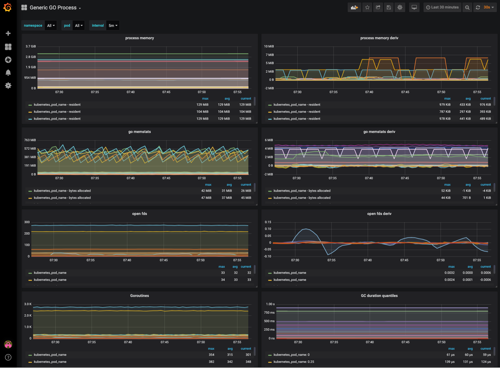 Process status published by Go Prometheus client library, e.g. memory used, fds open, GC details.