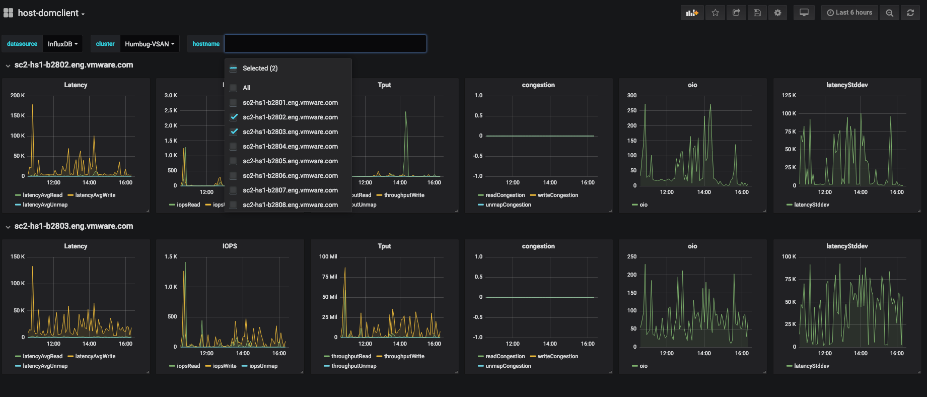 The VMware vSAN Host-domclient dashboard uses the influxdb data source to create a Grafana dashboard with the graph panel.