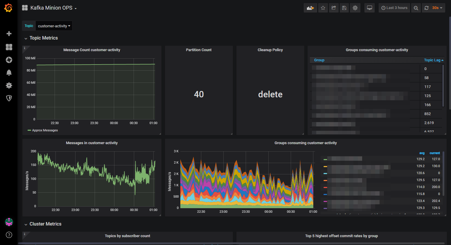 Kafka Minion is a promethues exporter to monitor consumer group lags, topic metrics as well as cluster wide metrics on a Kafka cluster. It provides valuable metrics to get more insight into your Kafka Topics and how your Consumer Groups are consuming them. It can also help to debug performance or consumer client issues.