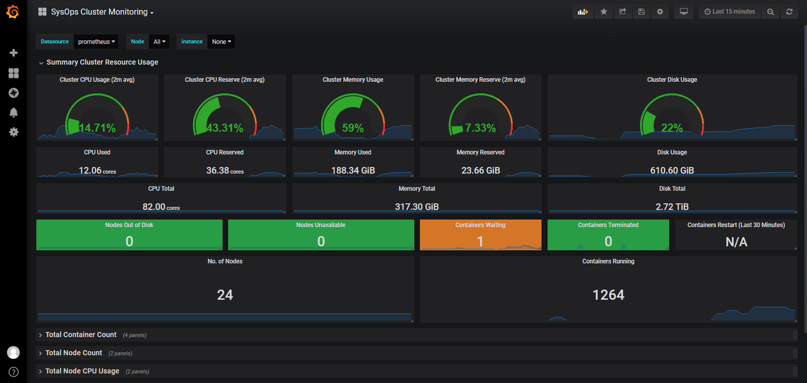 The SysOps Cluster Monitoring dashboard uses the prometheus data source to create a Grafana dashboard with the graph and singlestat panels.