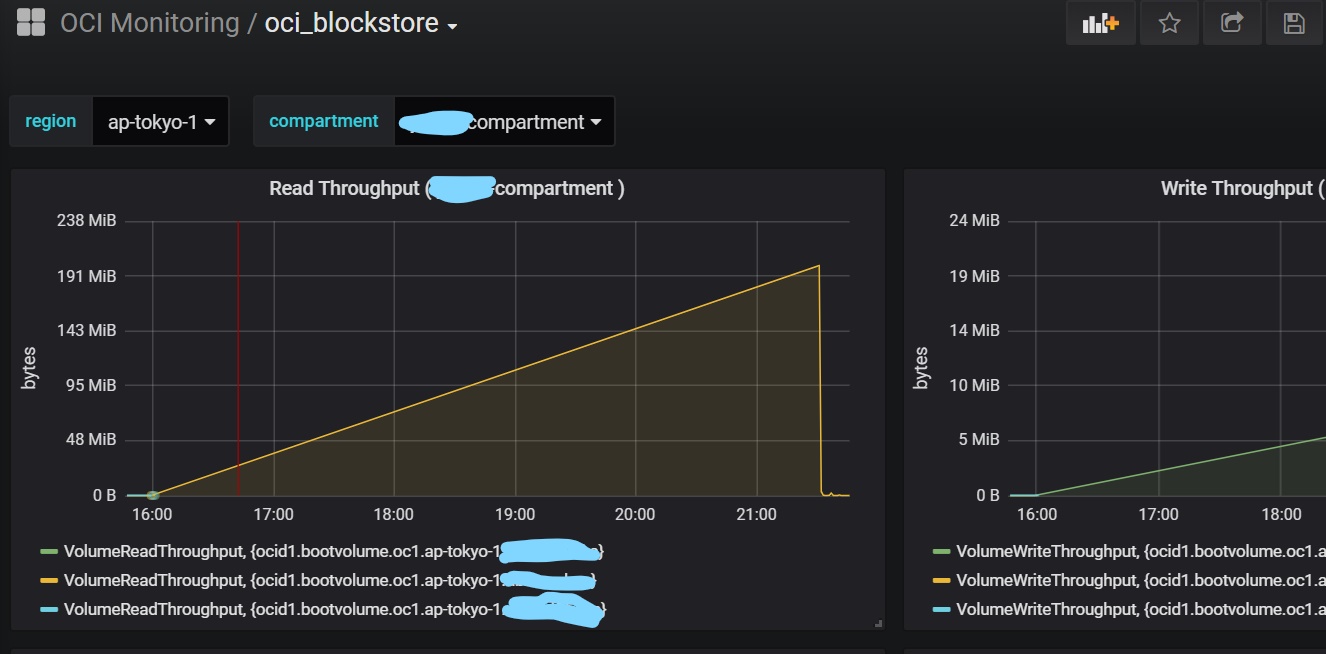 You can view oci_blockstire among the monitoring features of Oracle Cloud Infrastructure. The layout is the same as the screen of OCI monitoring. If you switch the region and compartment in the upper left, you can view the metrics of the volume you want to know.