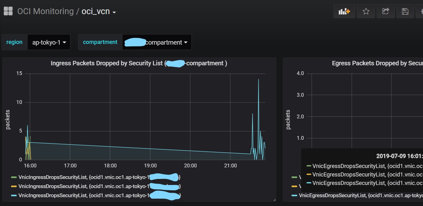 You can view oci_vcn among the monitoring features of Oracle Cloud Infrastructure. The layout is the same as the screen of OCI monitoring. If you switch the region and compartment in the upper left, you can view the metrics of the vcn you want to know.