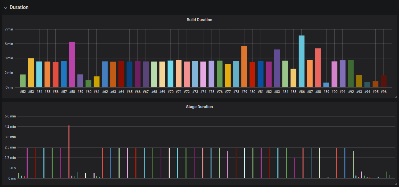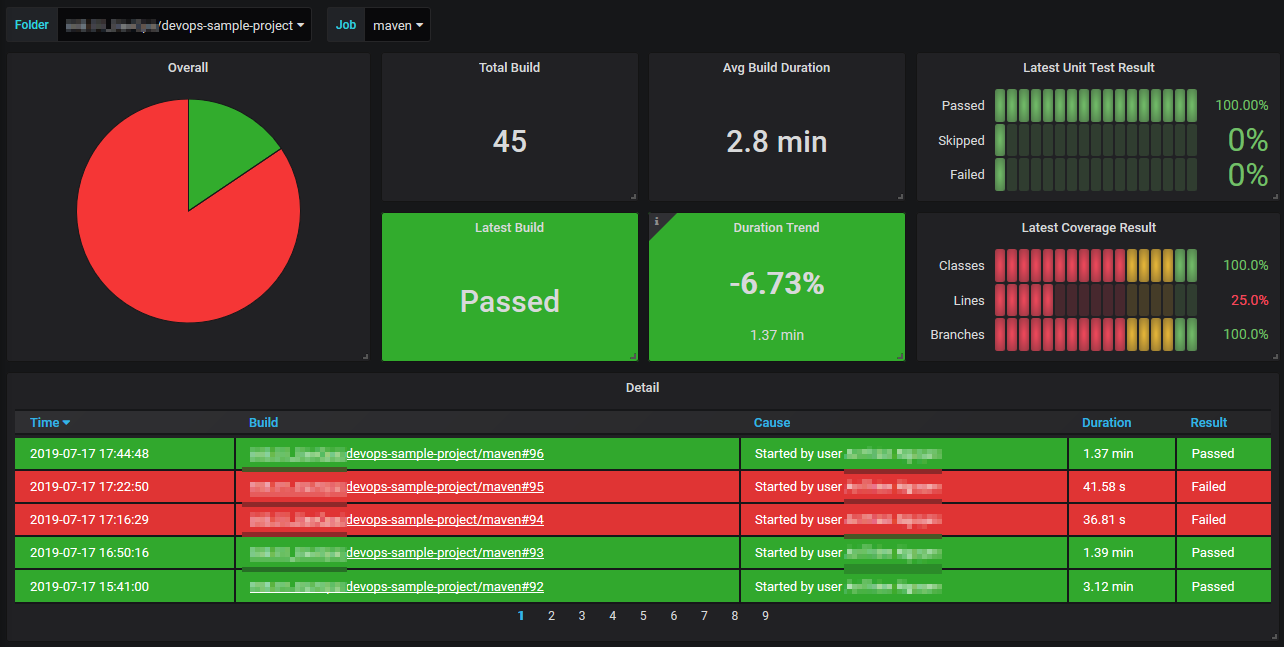 The Jenkins Build Status dashboard uses the influxdb data source to create a Grafana dashboard with the bargauge, btplc-trend-box-panel, grafana-piechart-panel, graph, singlestat and table panels.