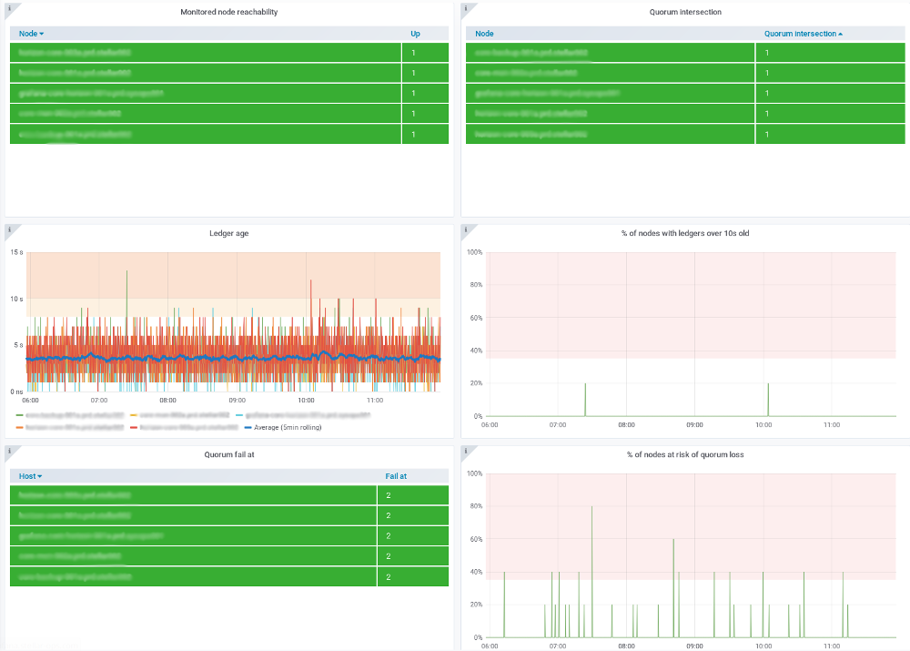 Visualizes curated set of monitoring focused metrics exposed by the stellar-core-prometheus-exporter. The dashboard shows the most important info about the nodes and aims to surface potential problems.