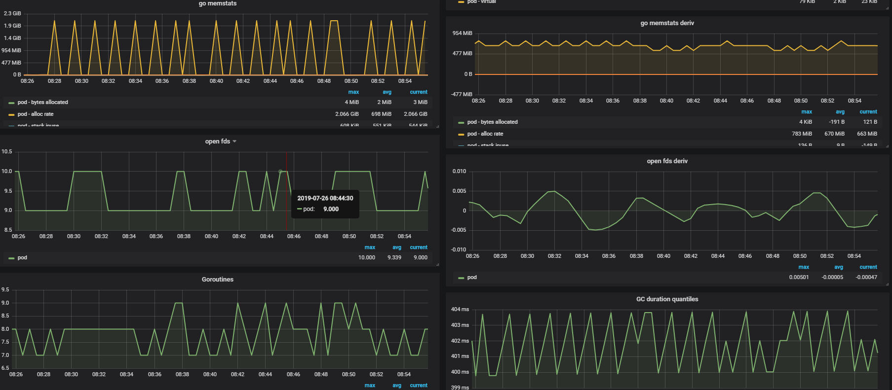 Process status published by Go Prometheus client library, e.g. memory used, fds open, GC details, http request, http request duration