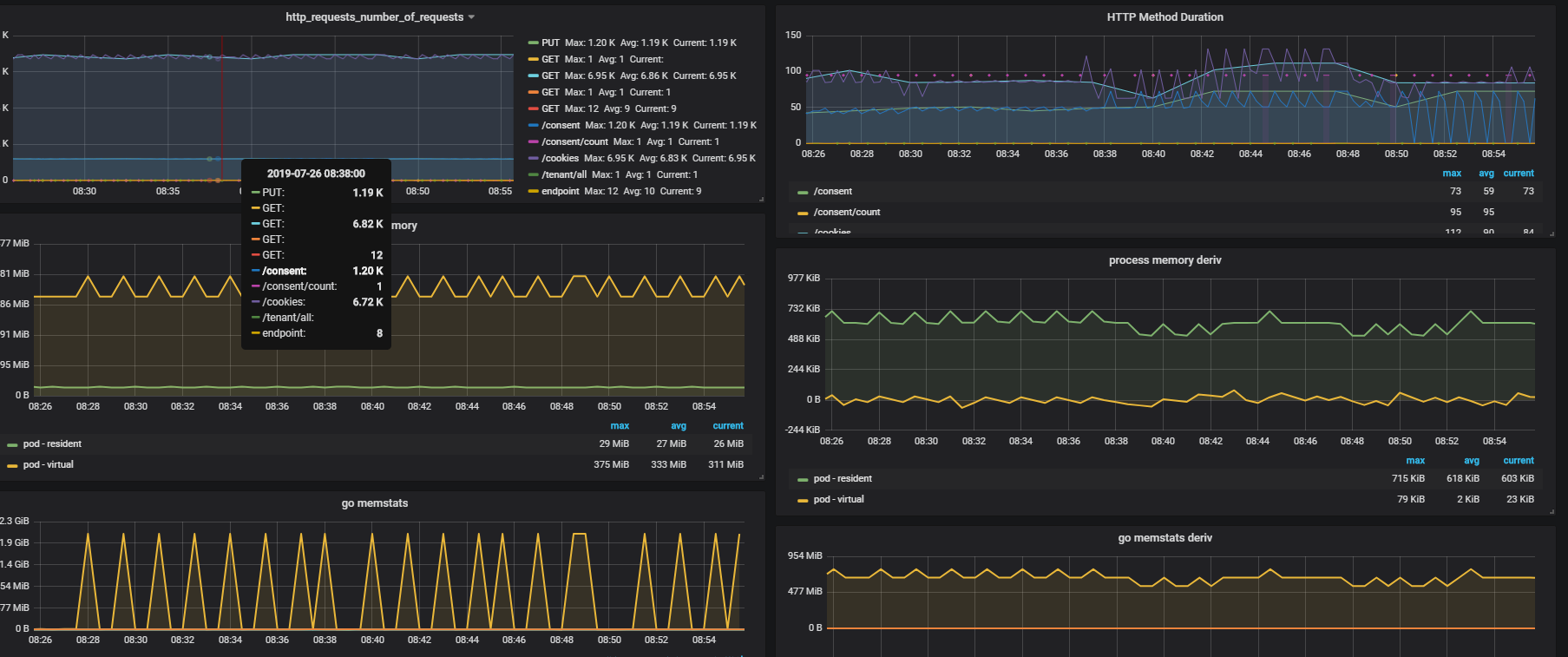 Go Process running on Azure Kubernetes Cluster, provided metrics by Prometheus client library, e.g. memory used, fds open, GC details, http request, http request duration