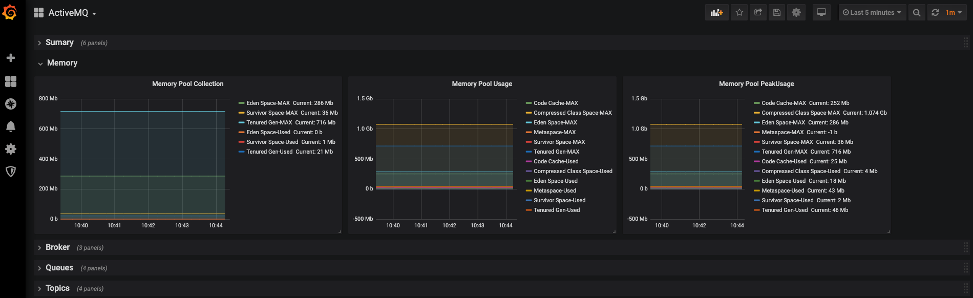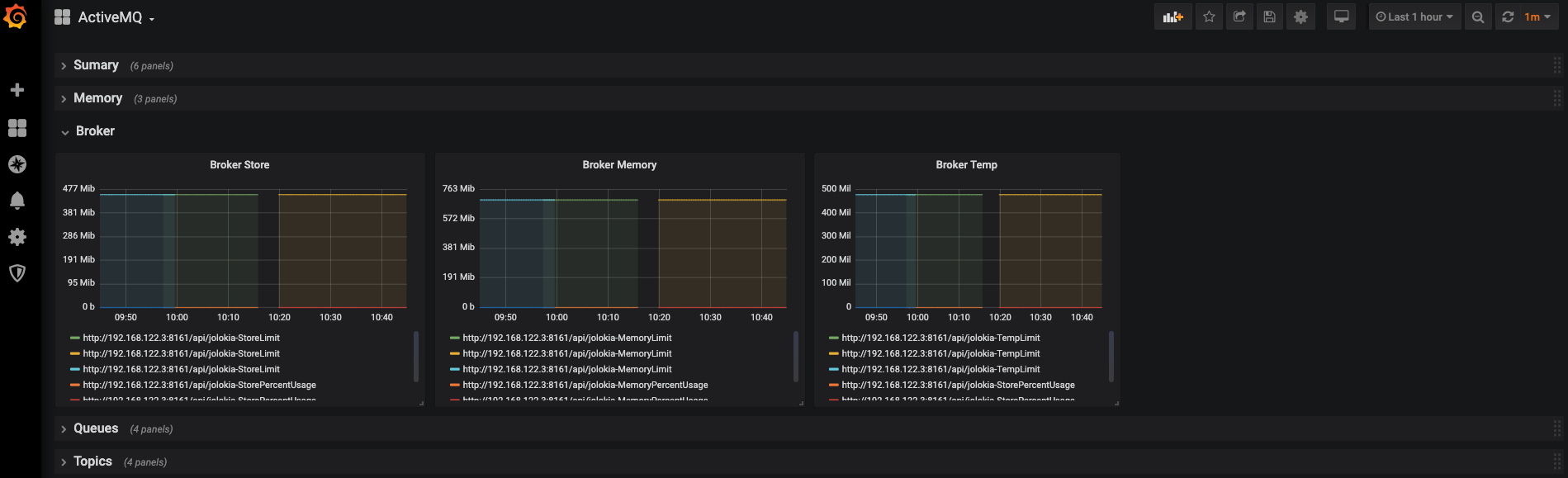 [[inputs.jolokia2_agent.metric]] name = "broker" mbean = "org.apache.activemq:brokerName=*,type=Broker" paths = ["TotalConsumerCount","TotalMessageCount","TotalEnqueueCount","TotalDequeueCount","MemoryLimit","MemoryPercentUsage","StoreLimit","StorePercentUsage","TempPercentUsage","TempLimit"] tag_keys = ["brokerName"]