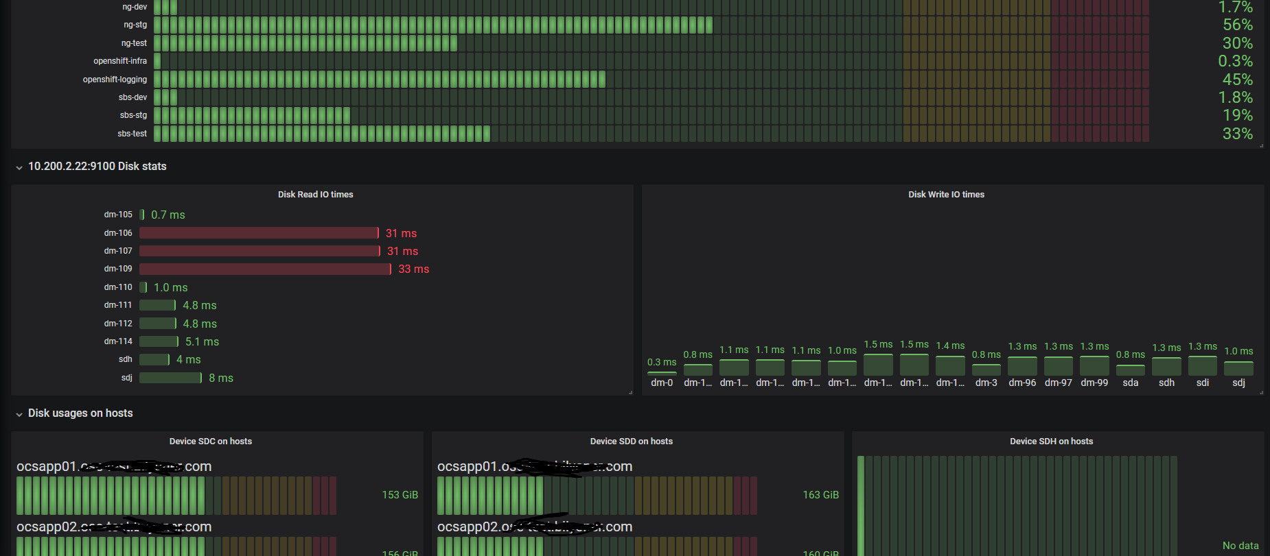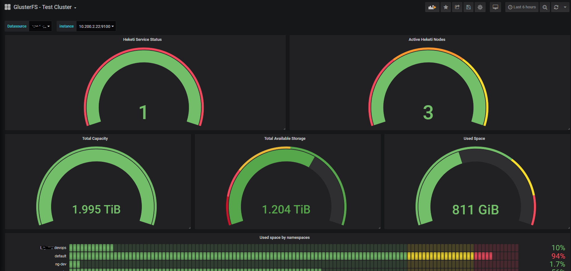 Shows glusterfs capacity, usage, namespace storage usage, node disk io times and disk usages. Some filters in variables and graphs should be changed before use.