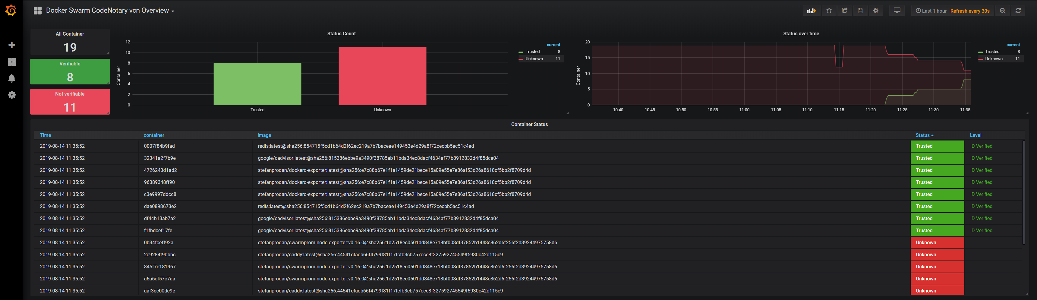 This dashboard shows the running Docker swarm (docker container platform) container verification status based on CodeNotary.io results.