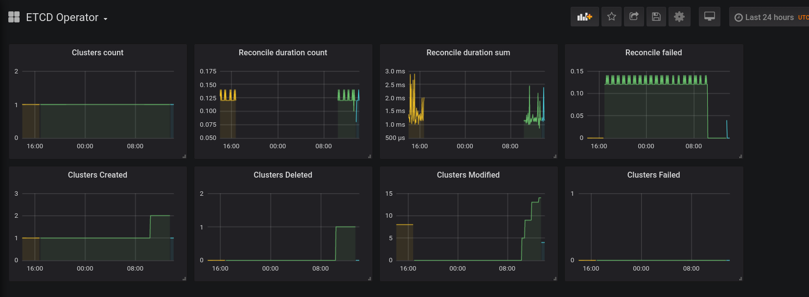 Very basic dashboard for etcd-operator v0.9.4 run on k8s and scraped by prometheus (you may need to add etcd-operator service, prometheus servicemonitor on your own).
