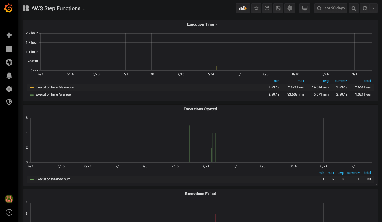 The AWS Step Functions dashboard uses the data source to create a Grafana dashboard with the panel.