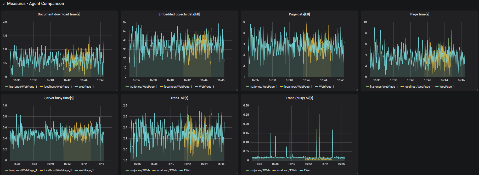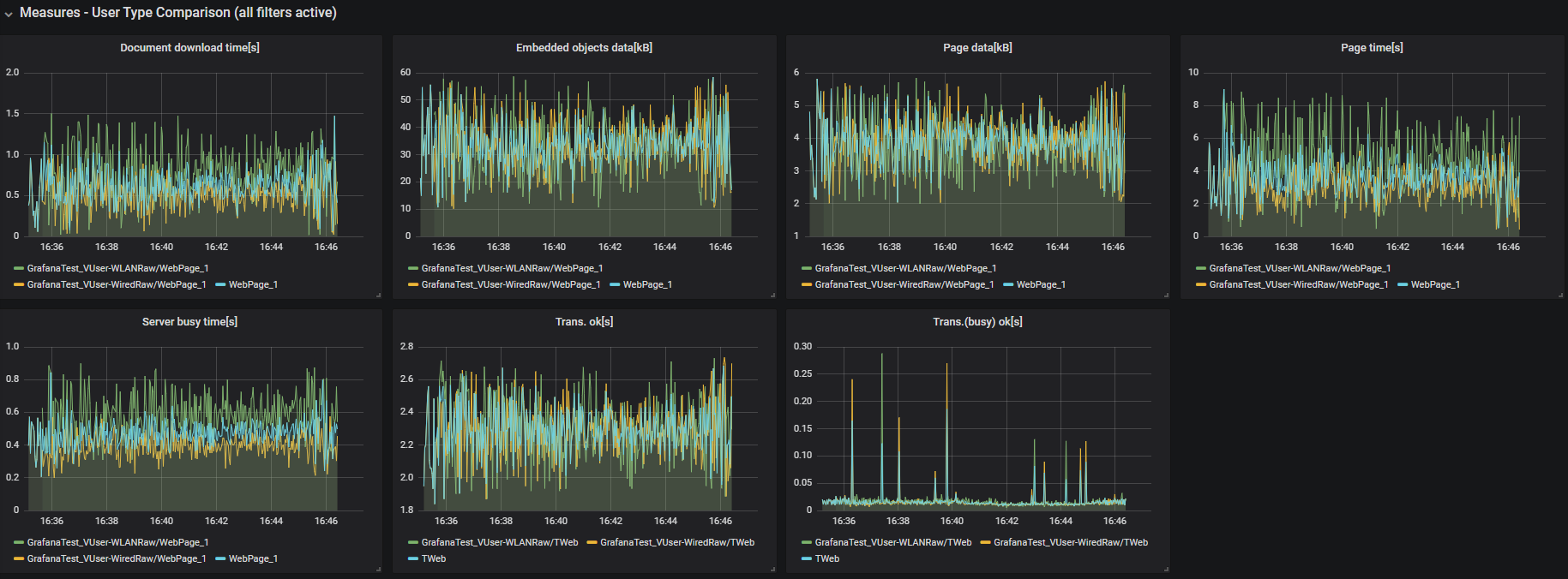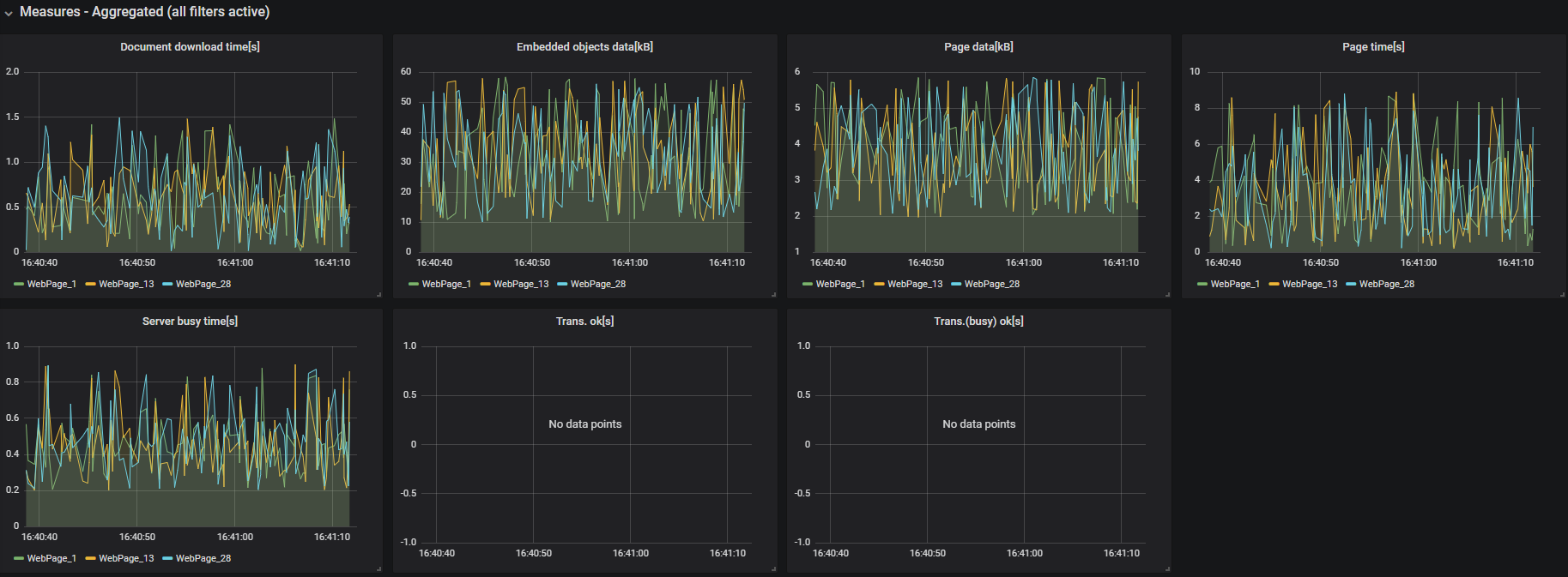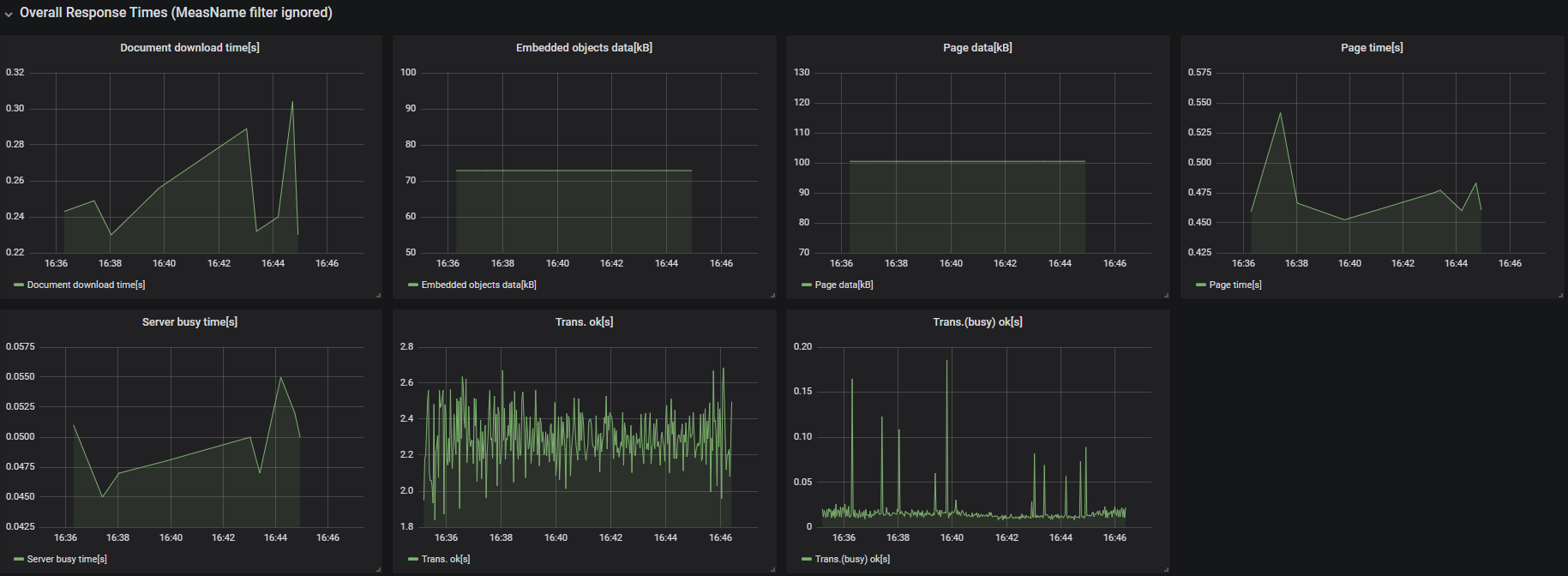 Displays a selection of graph panels based on Silk Performer measurements, imported from raw data files into an InfluxDB instance.