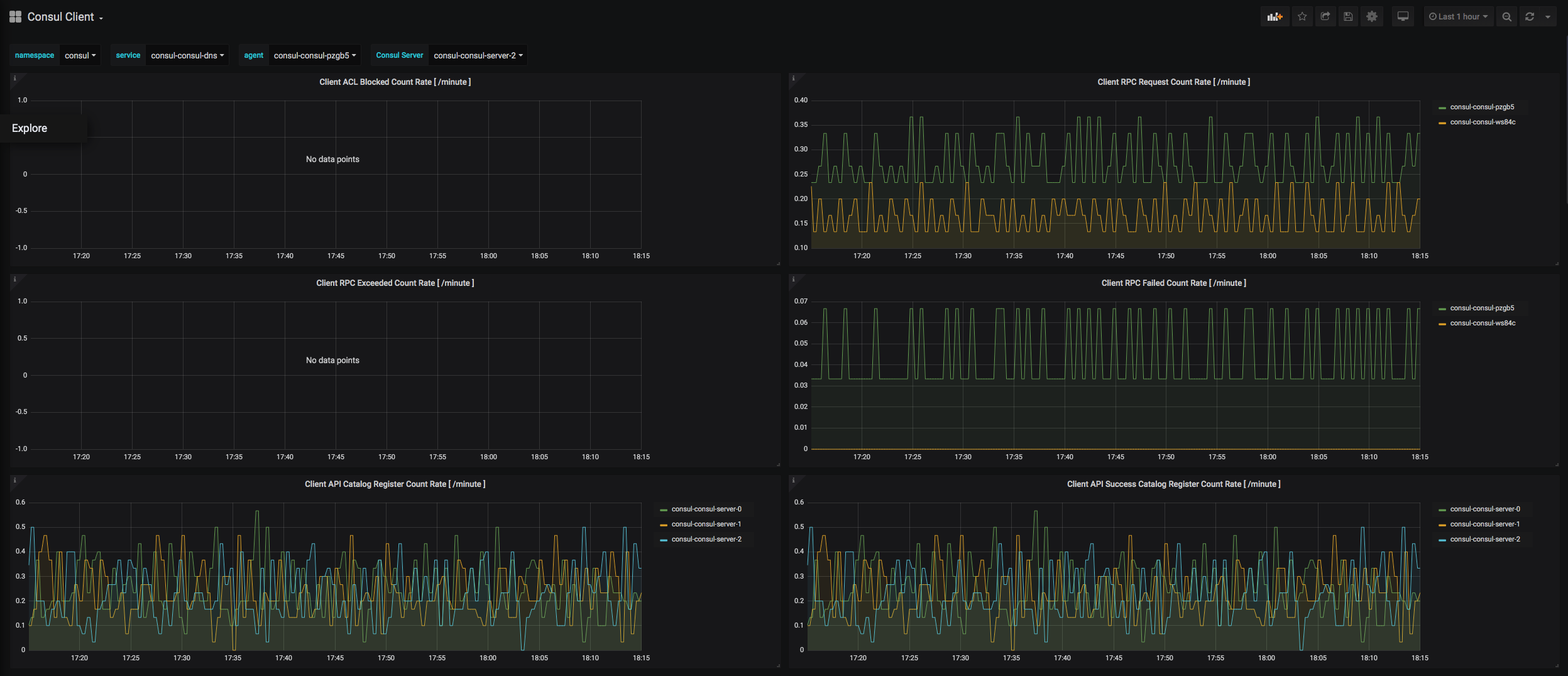 The Consul Client dashboard uses the prometheus data source to create a Grafana dashboard with the graph panel.