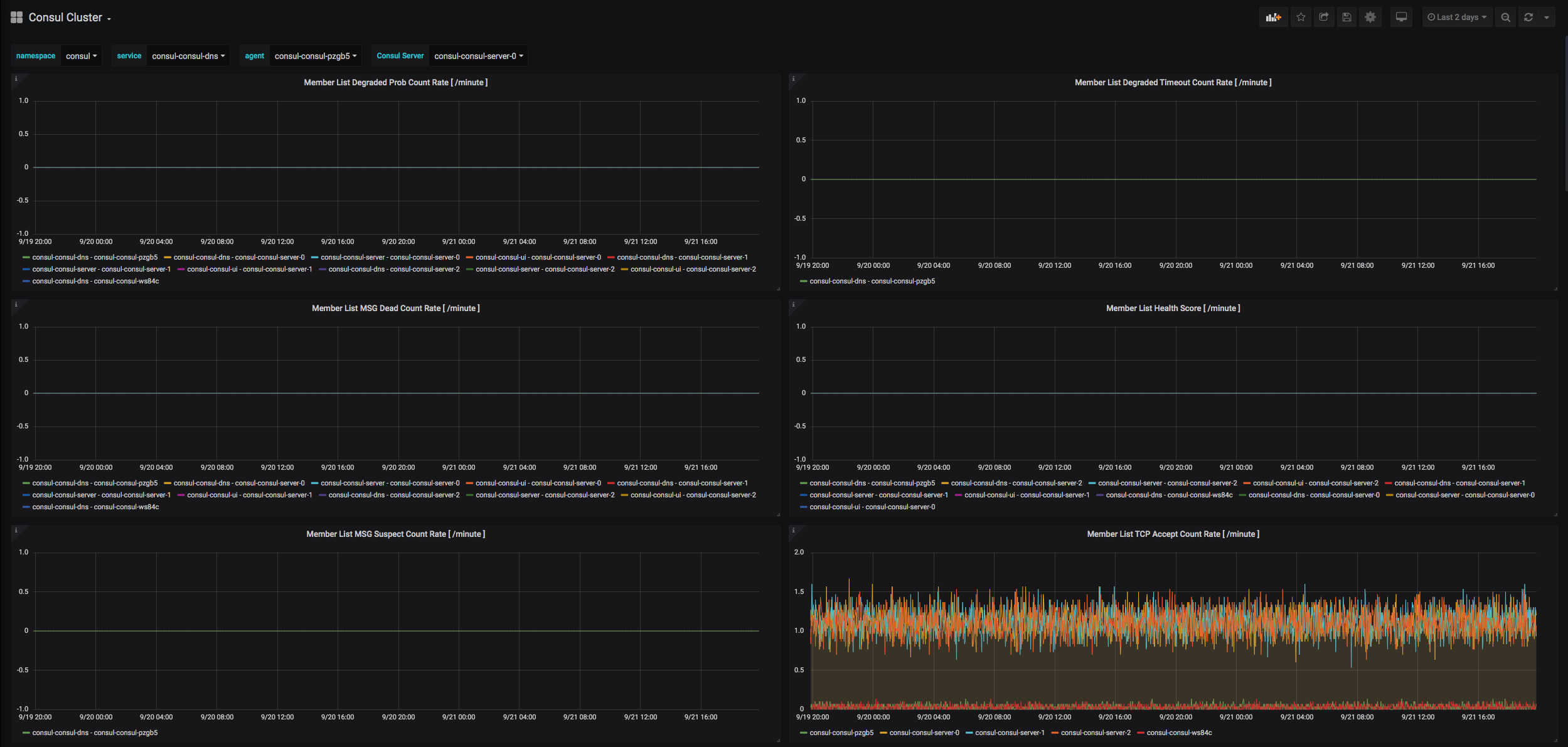 The Consul Cluster dashboard uses the prometheus data source to create a Grafana dashboard with the graph panel.