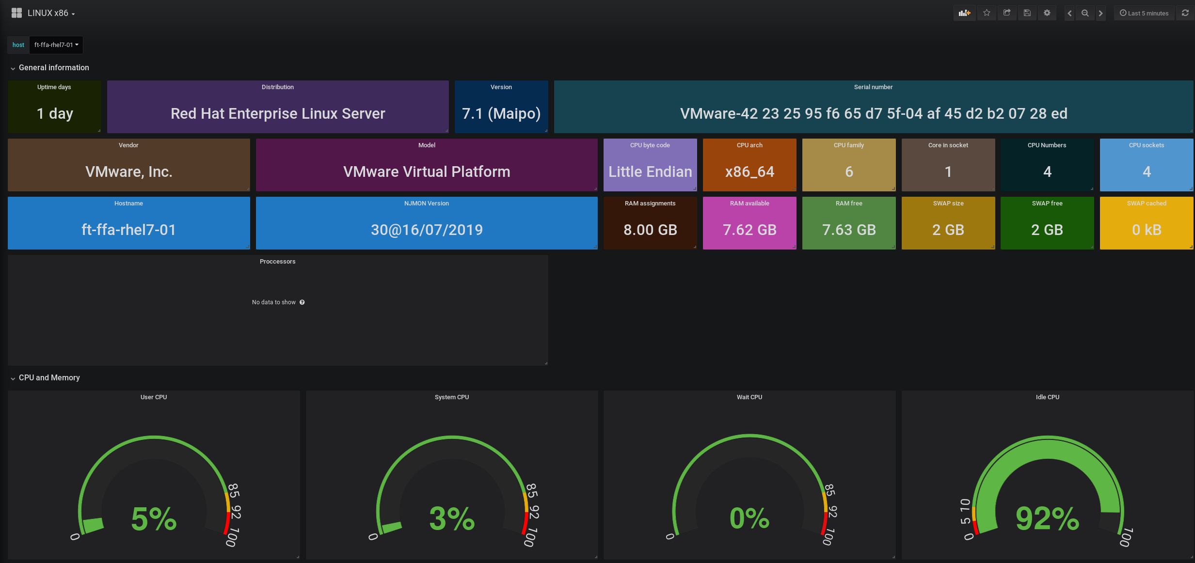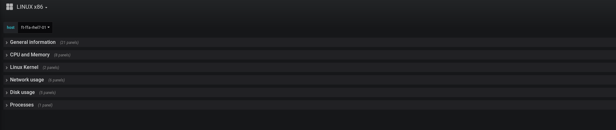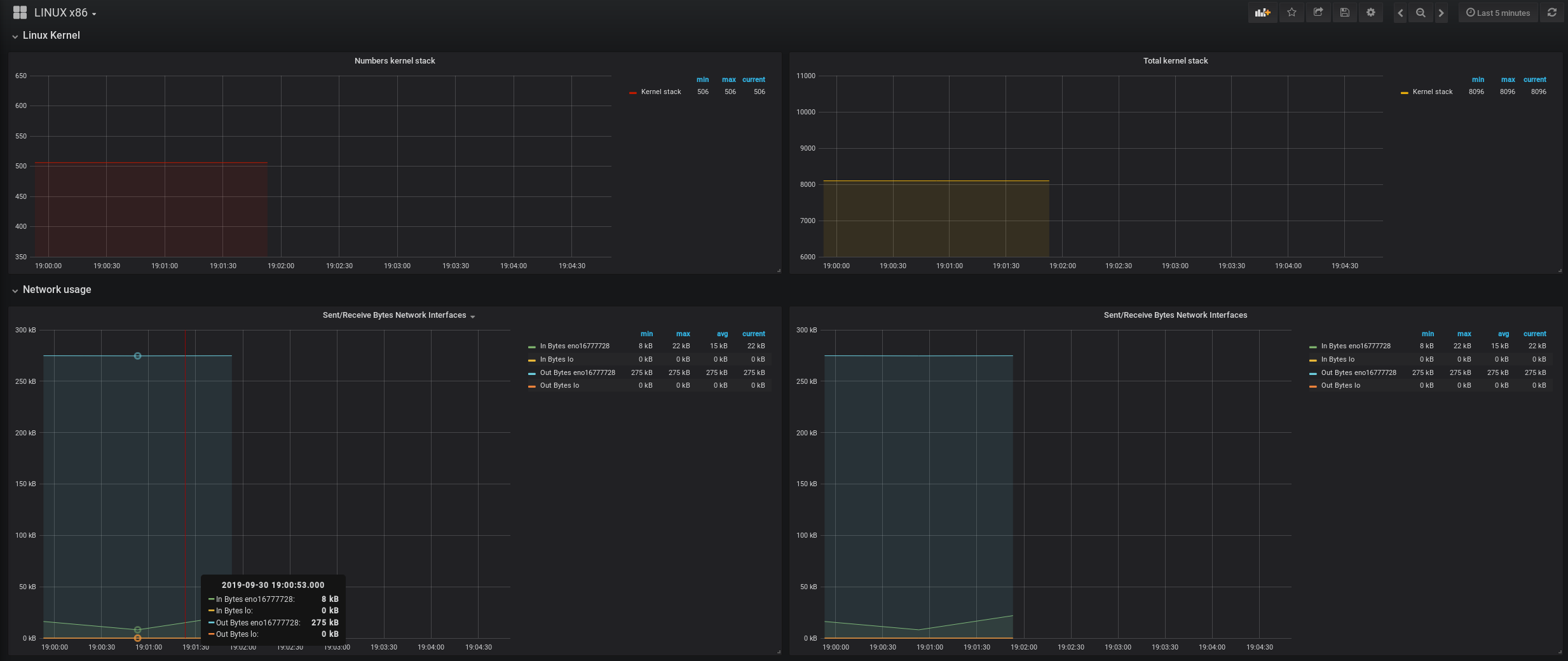 The LINUX x86 dashboard uses the influxdb data source to create a Grafana dashboard with the graph, singlestat and table panels.